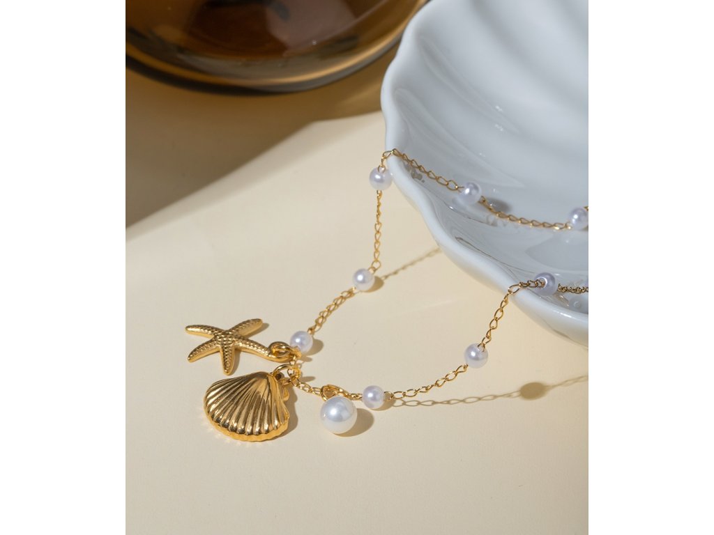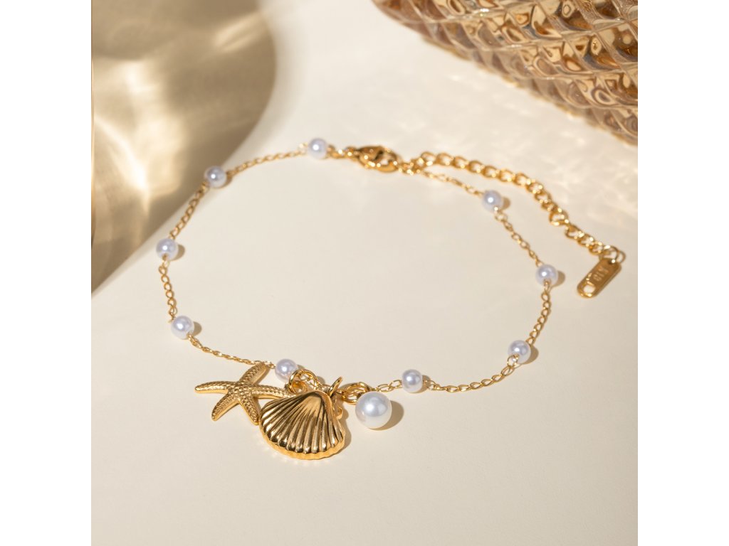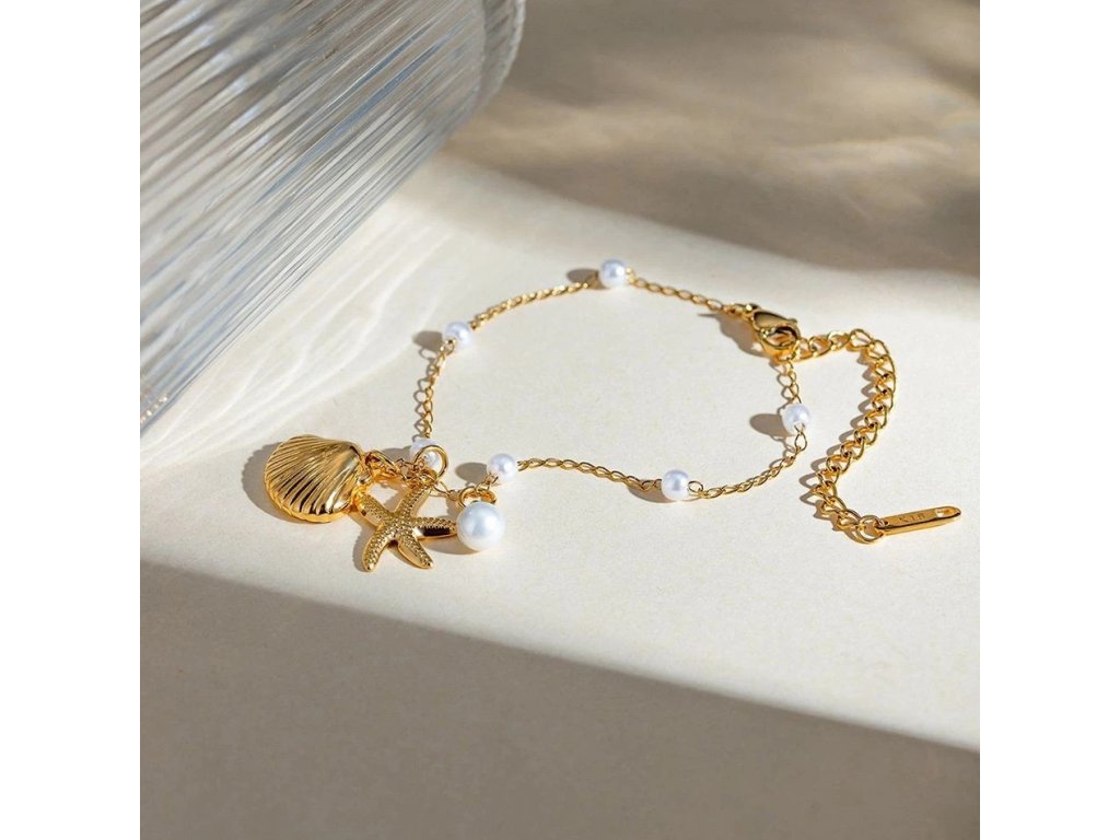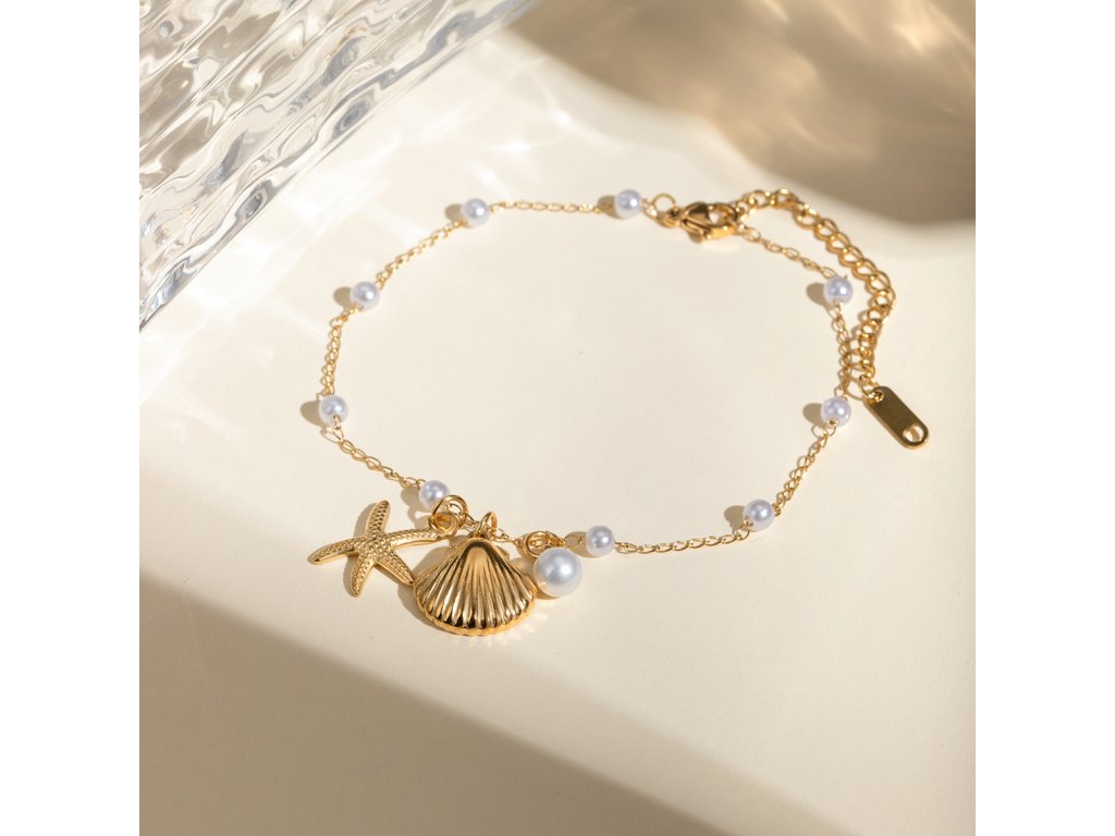 ELENYS Sea Whisper je jemný náramek na nohu, který v sobě nese atmosféru letních dní u moře. Lehký řetízek zdobený perlami působí vzdušně a přirozeně, zatímco zlaté přívěsky mušle a hvězdice dodávají šperku symboliku a hloubku.