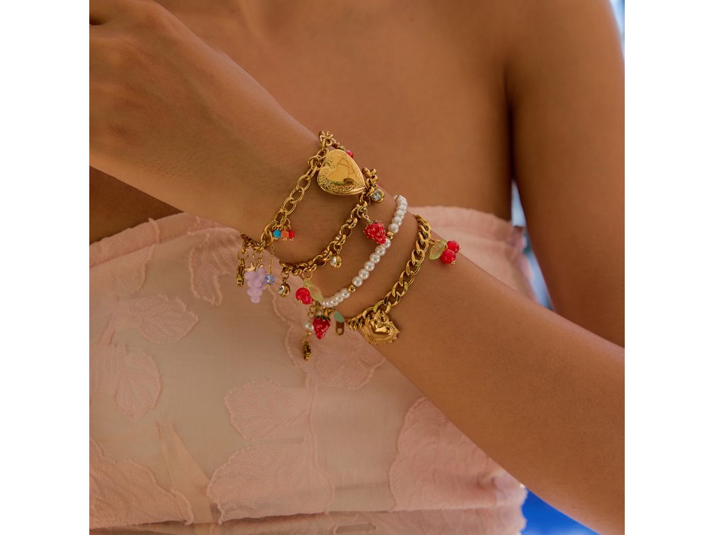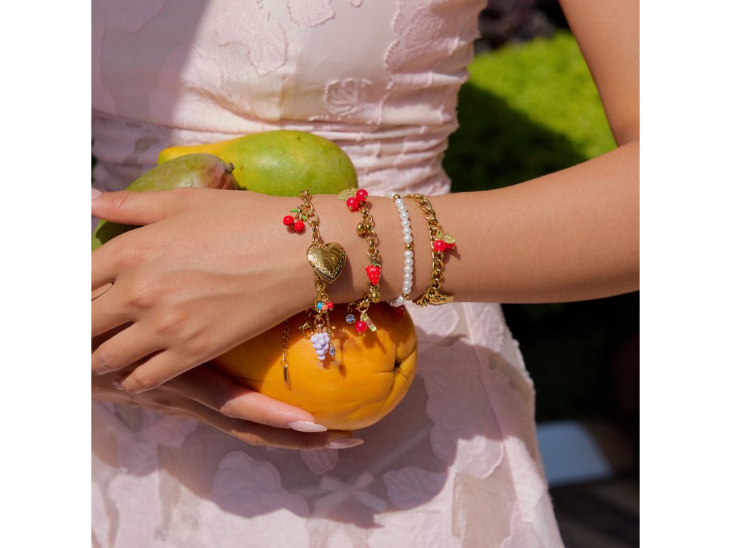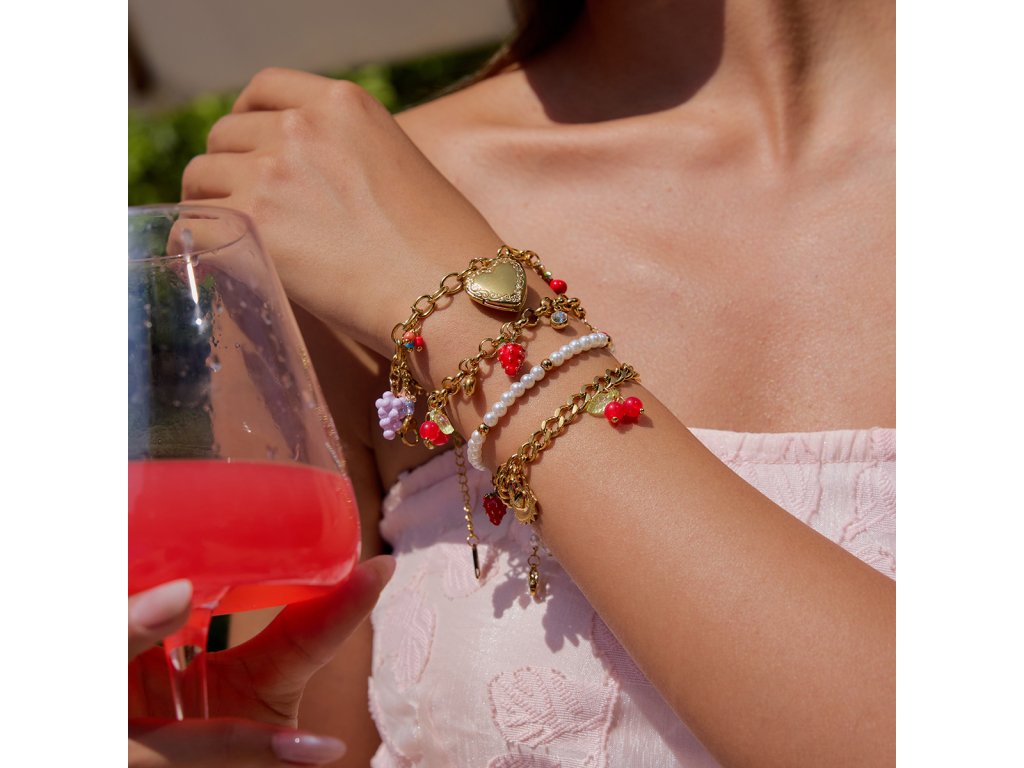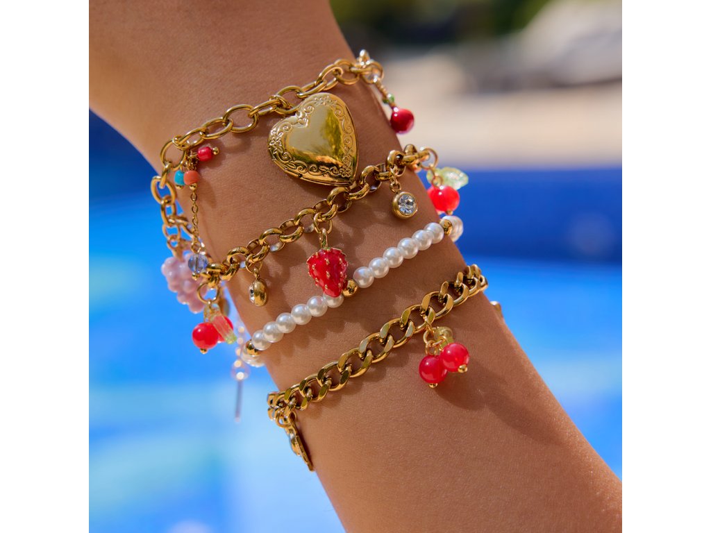 Hravý a romantický letní náramek, který upoutá pozornost červenou jahůdkou. Kombinace zlatého řetízku, perliček a zlatých korálků dodá vašemu outfitu lehkou svěžest a radost.