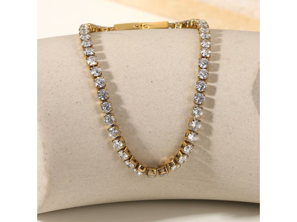 Jemný, ale nepřehlédnutelný tenisový náramek ve zlatém tónu. Čiré zirkony s brilantovým efektem v pravidelném rytmu dodají elegantní šmrnc jak denním outfitům, tak večerním šatům.