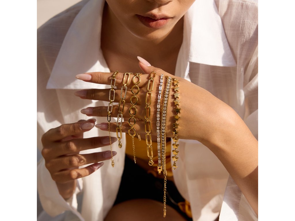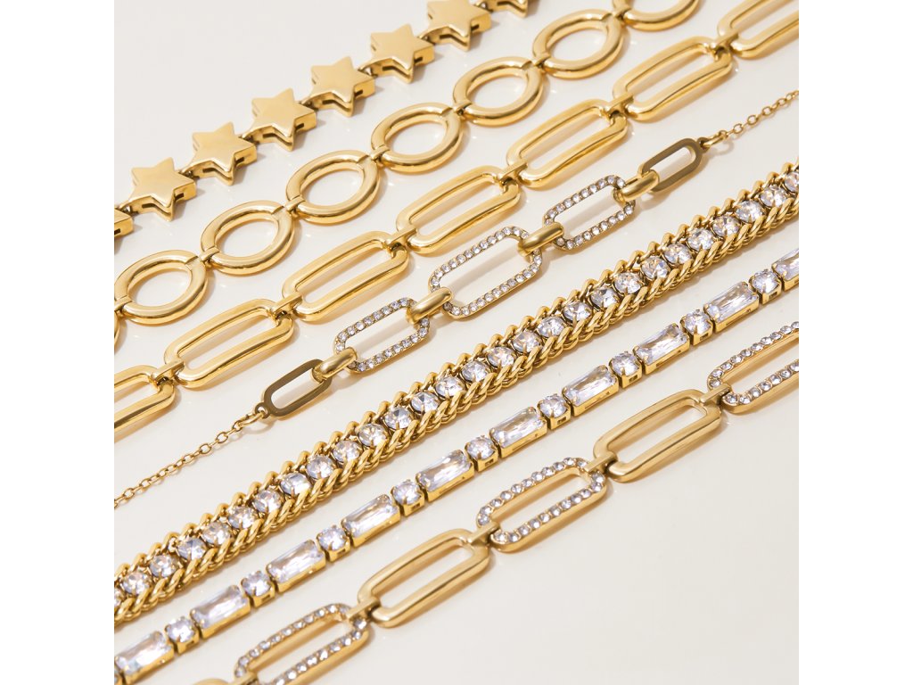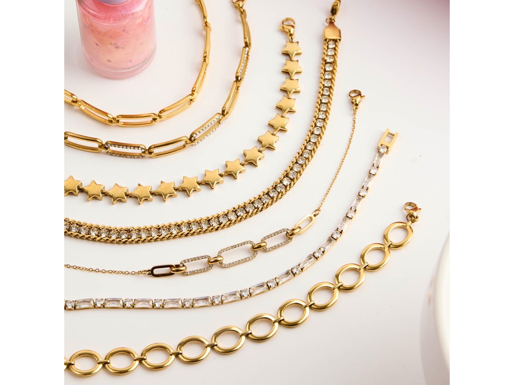Základ tvoří hypoalergenní chirurgická ocel s povrchovou úpravou Elenys Signature Gold™ v odstínu 18k žlutého zlata. Náramek je voděodolný, barevně stálý a vhodný pro každodenní nošení.