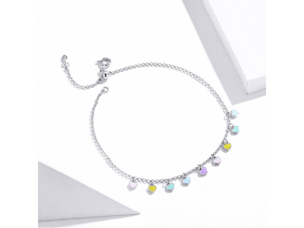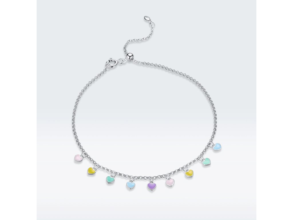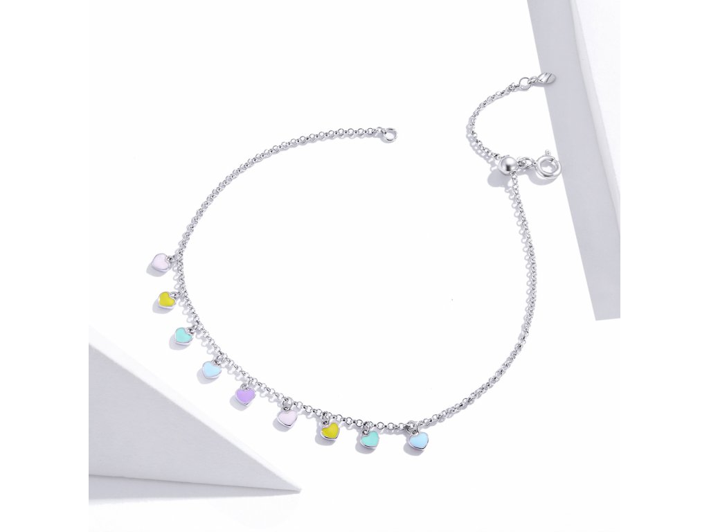 - Stříbrný nastavitelný náramek na nohu nebo na zápěstí v designu milovaných duhových srdíček zdobených ručně nanášenou barevnou glazurou. Originální design náramku, kvalitní zpracování a materiál, ručně dohotovené.