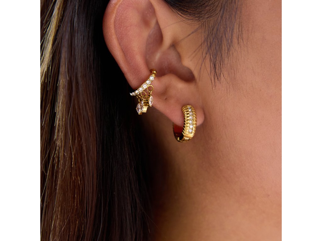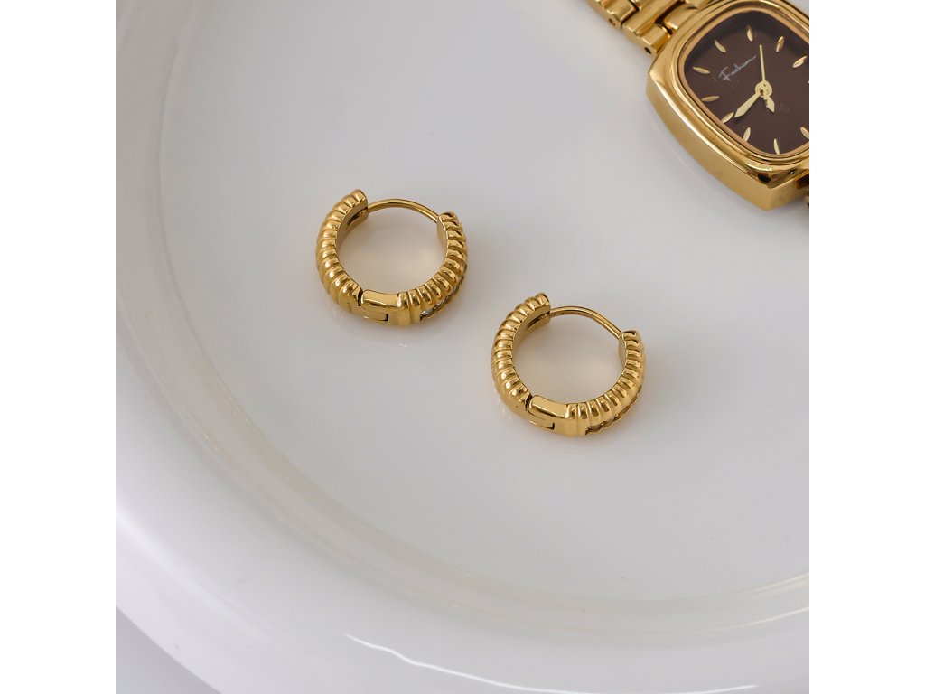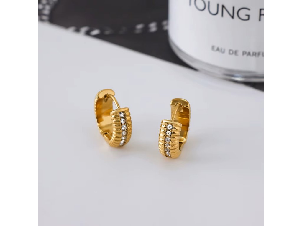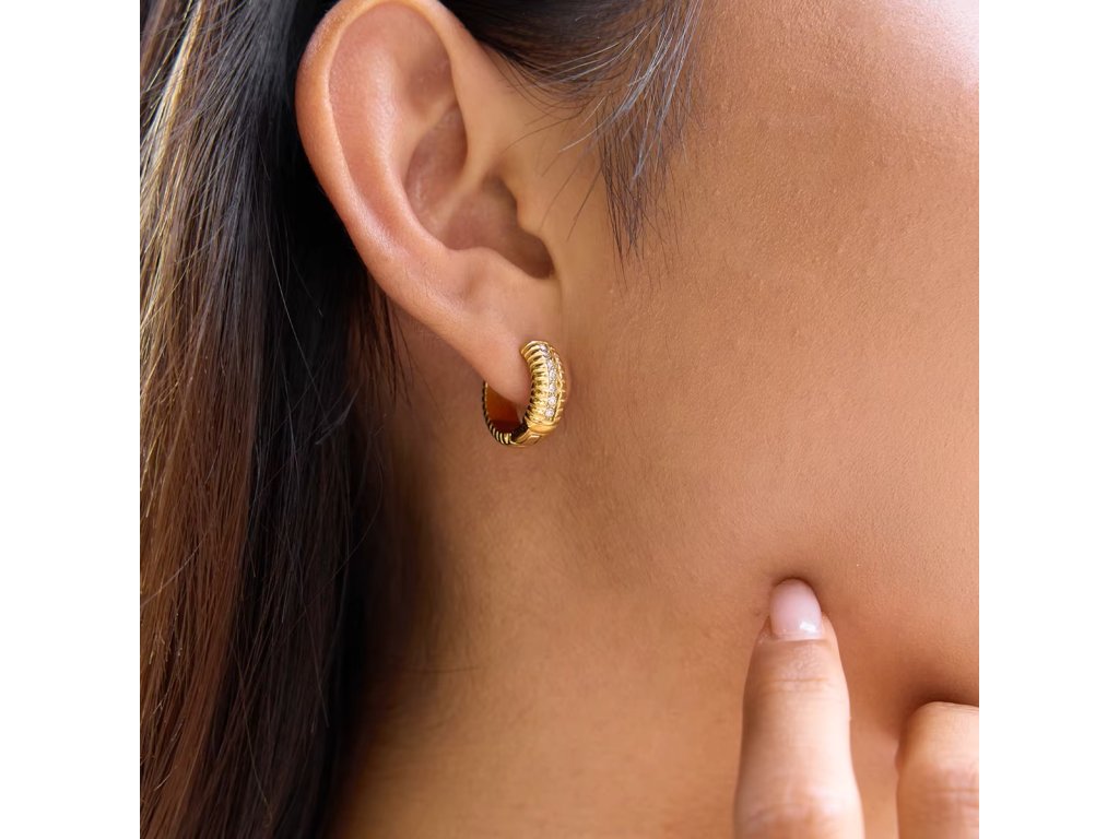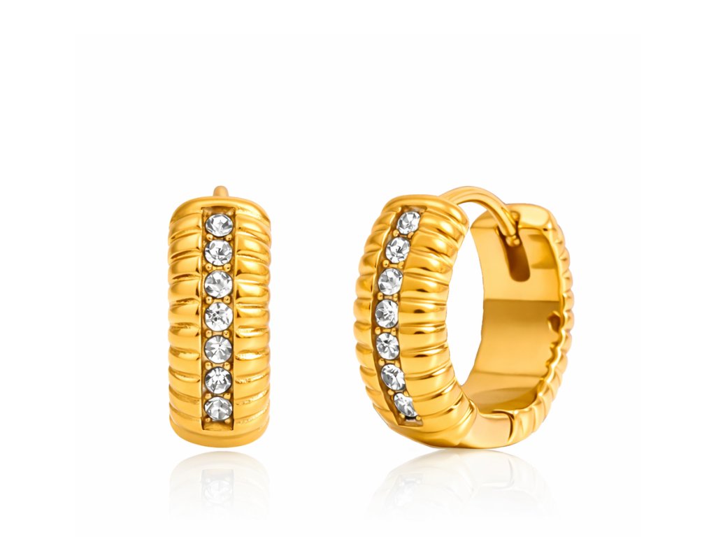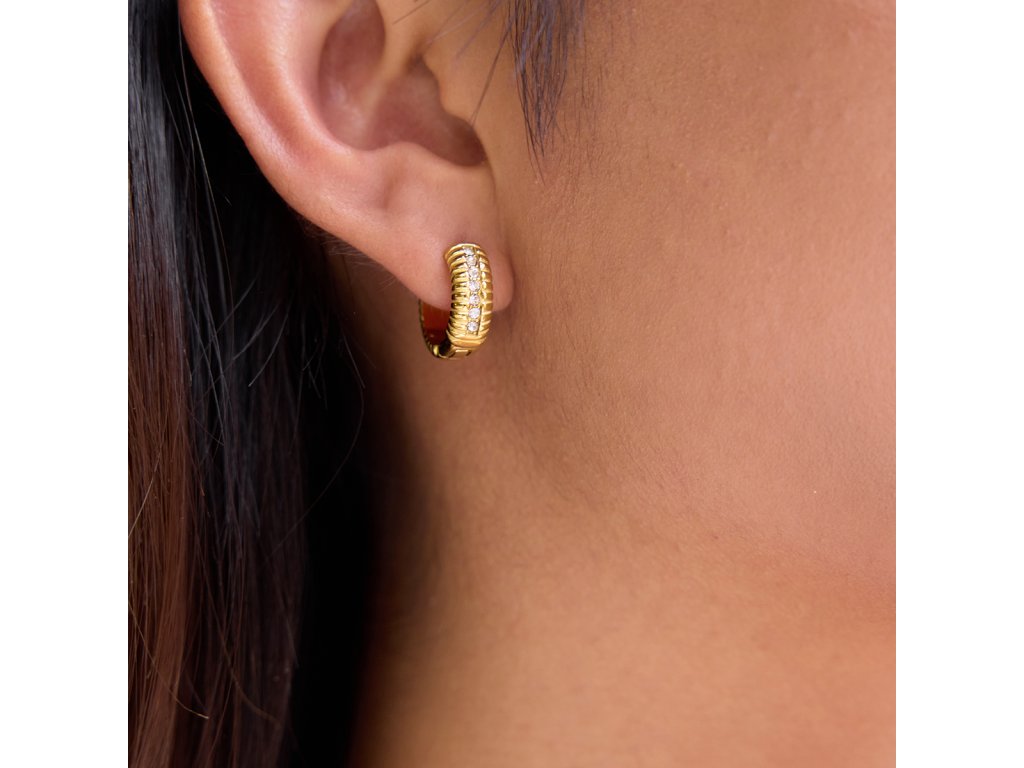 ELENYS Riva jsou pozlacené kroužkové náušnice se žebrovaným profilem a jemnou řadou čirých zirkonů. Působí výrazněji než klasické hladké kroužky, ale pořád zůstávají čisté a nositelné.