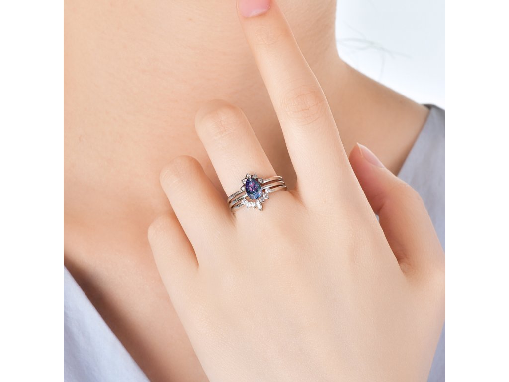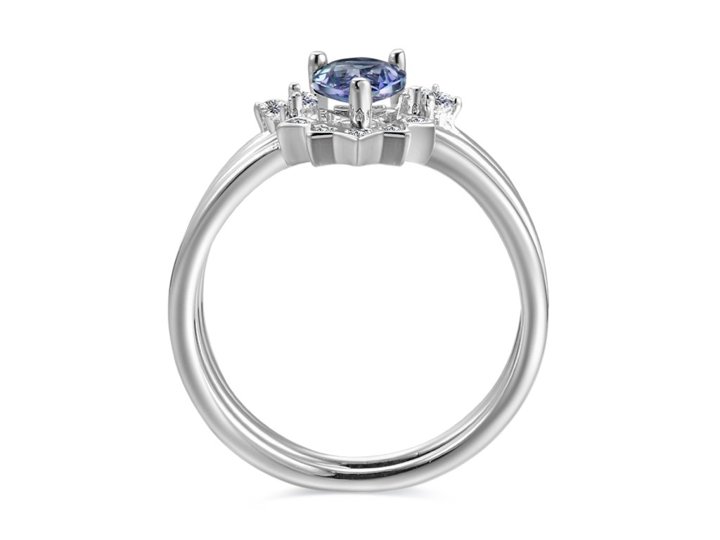 - Hypoalergení stříbrný prsten pozlacený 18 karátovým bílým zlatem zdobený Alexandritem a zirkony. Originální design prstenu, kvalitní zpracování a materiál, ručně dohotovené.