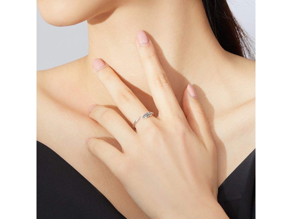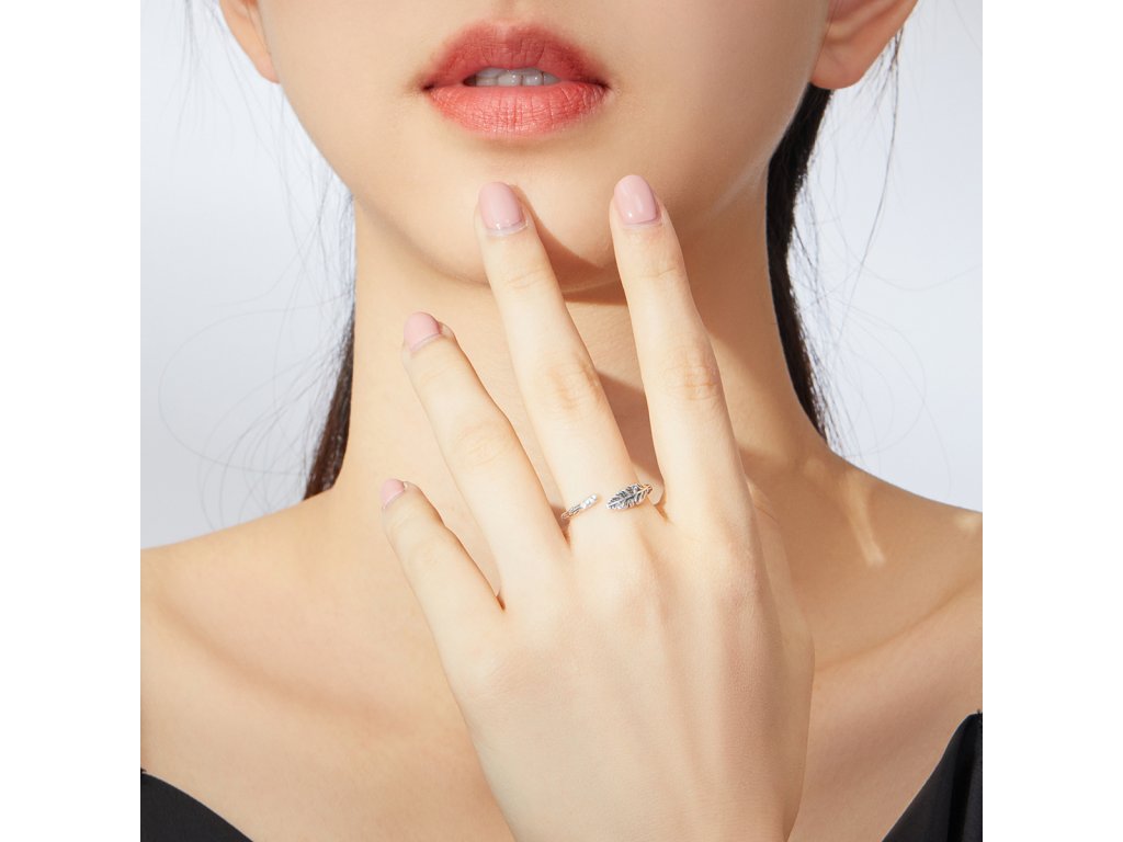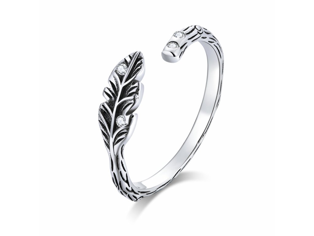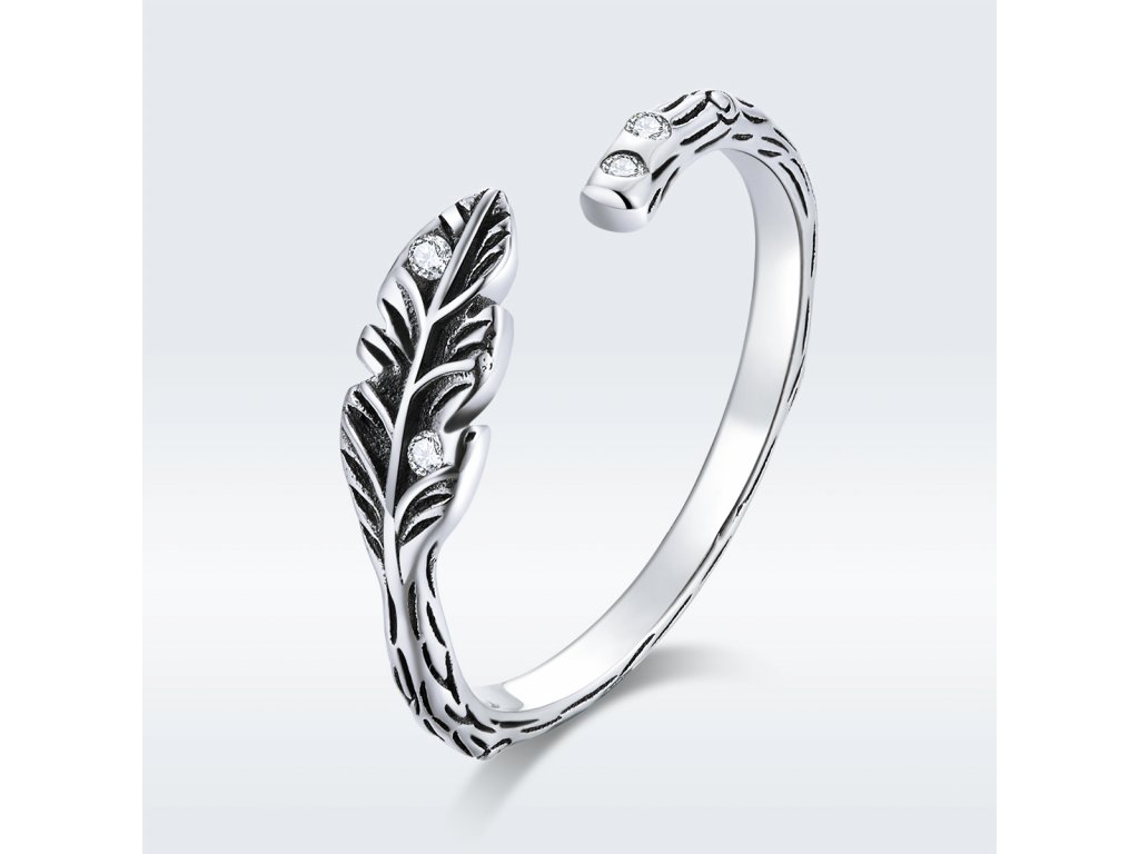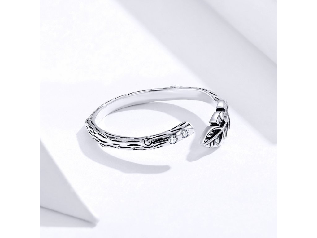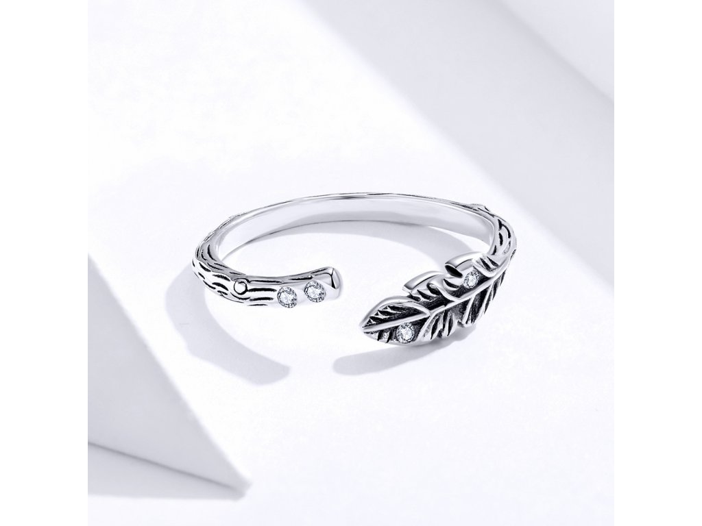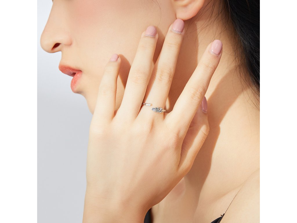 - Stříbrný nastavitelný prsten v designu propracovaného smaltovaného lístku zdobeného čirými třpytivými zirkony. Originální design prstenu, kvalitní zpracování a materiál, ručně dohotovené.