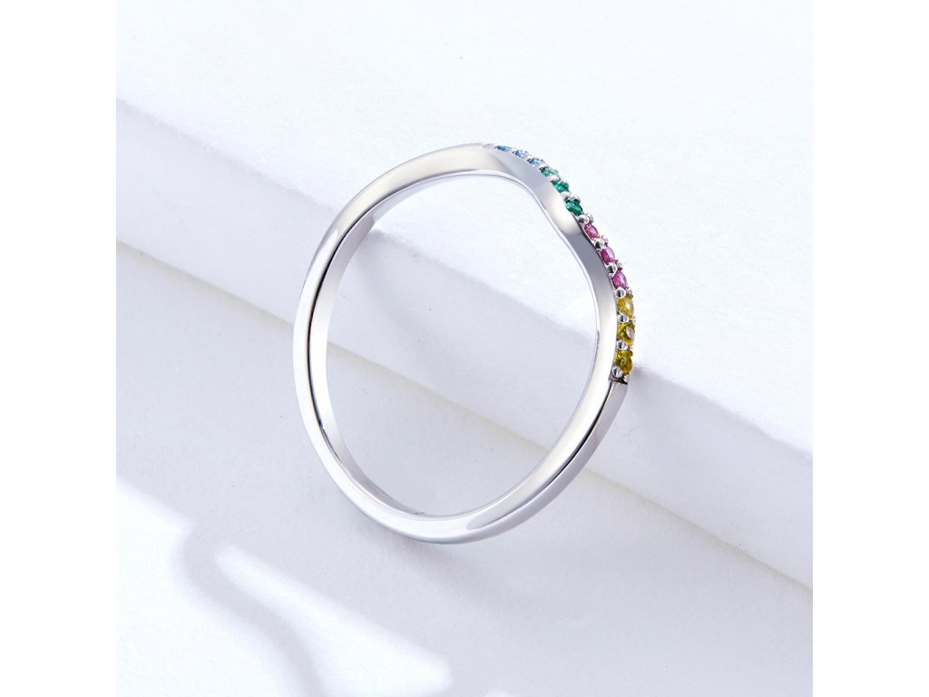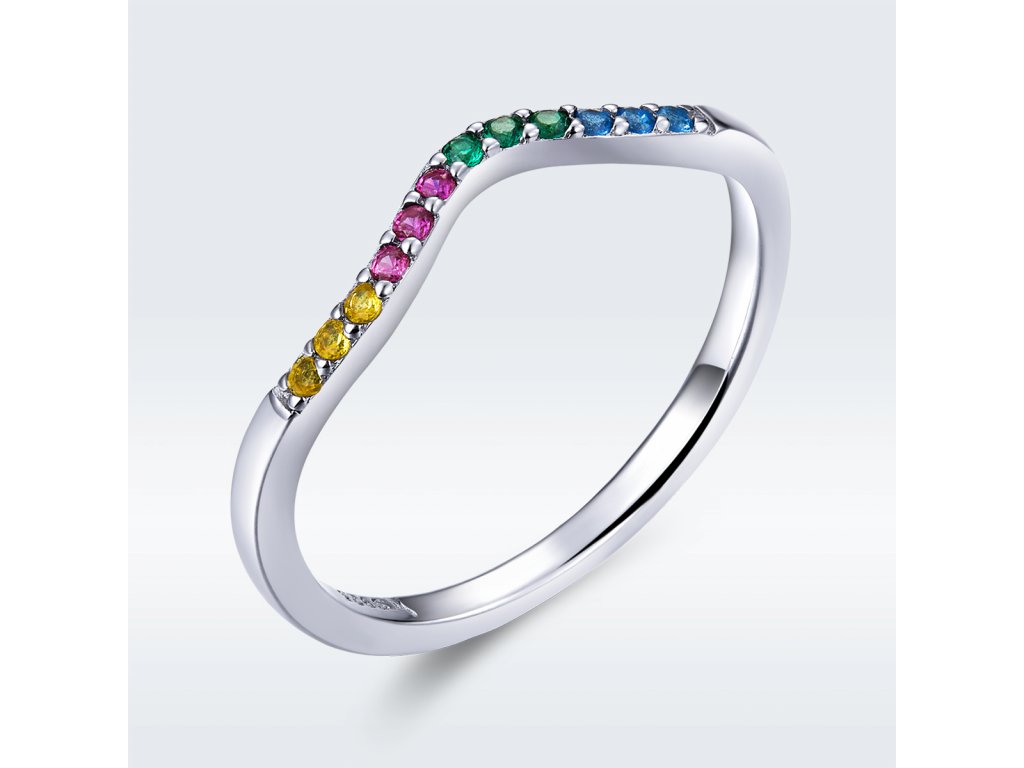 - Stříbrný prsten v designu Duhové vlnky zdobené barevnými kameny v podobě třpytivých zirkonů. Originální design prstenu, kvalitní zpracování a materiál, ručně dohotovené.