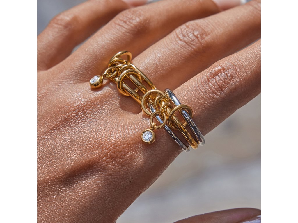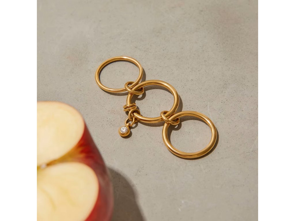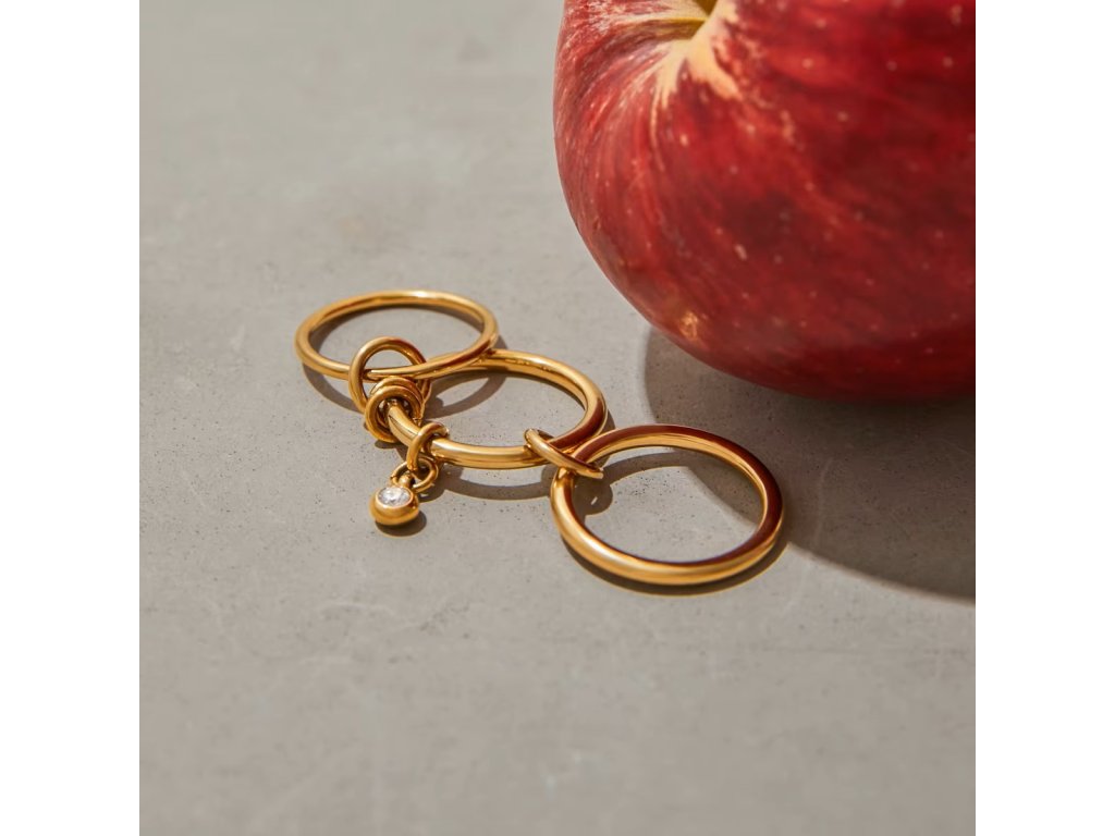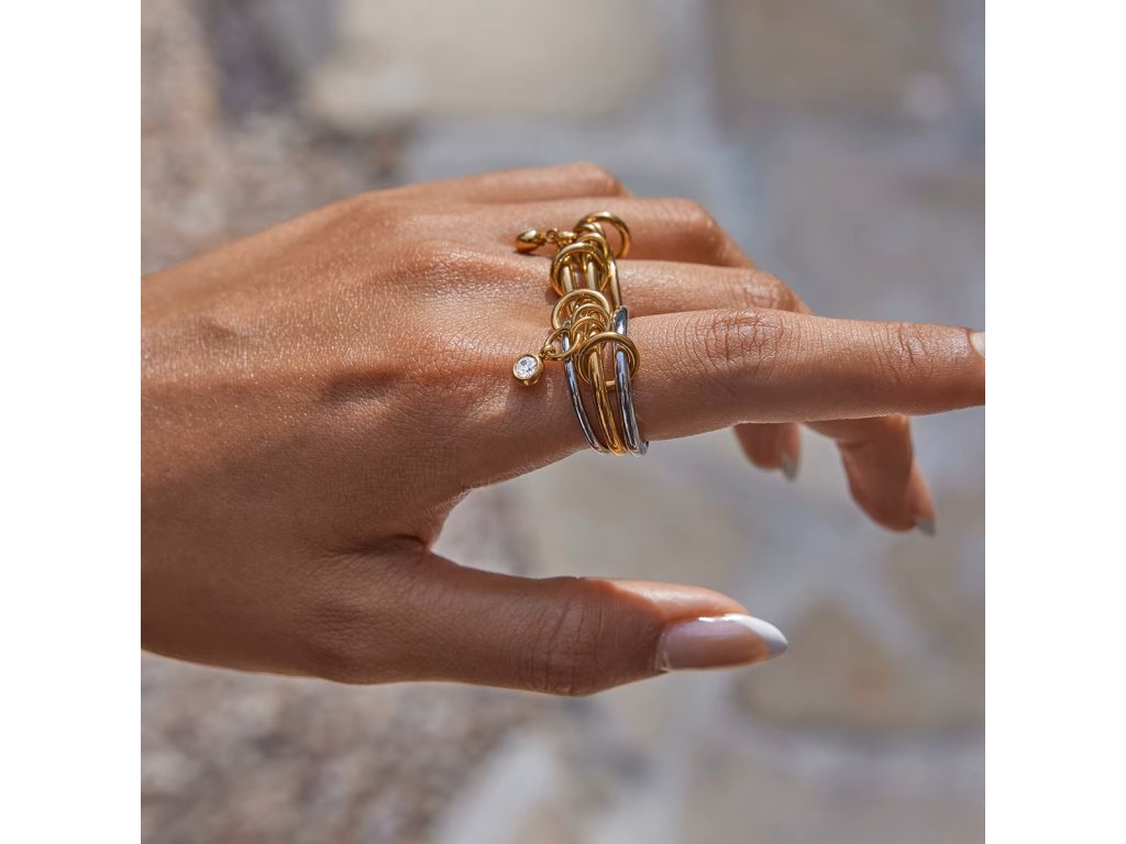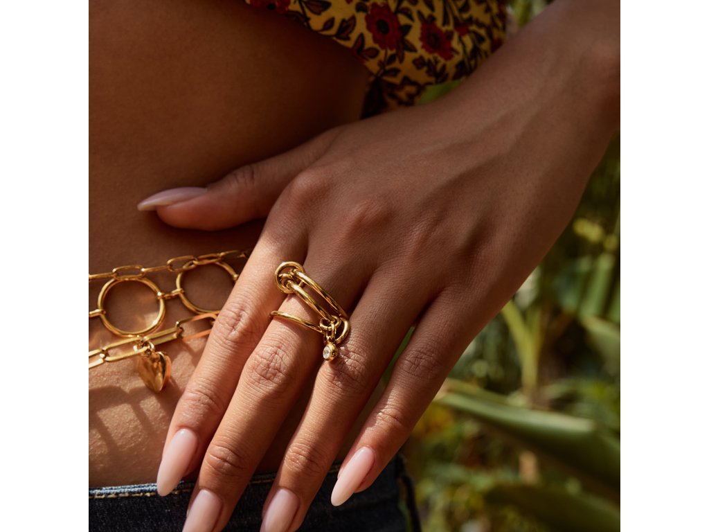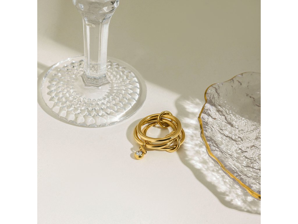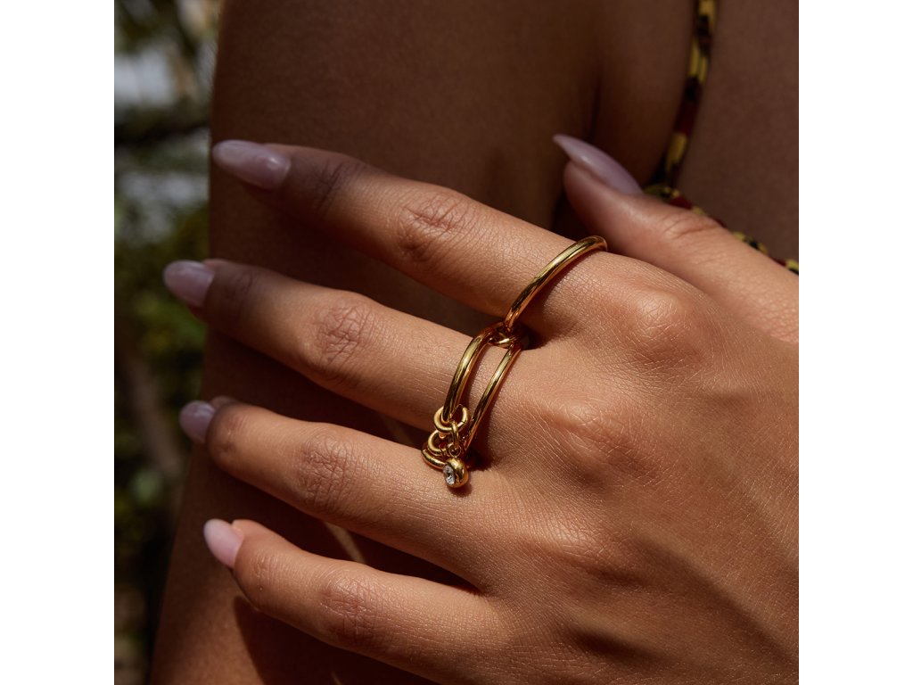 Jeho tvar je pohodlný a jemně obepíná prst, takže se stává ideálním doplňkem pro každodenní nošení. Elegantní kruhový detail v lesklém zlatu působí jako moderní amulet, který dodává sebedůvěru a vnitřní klid.