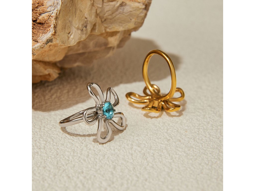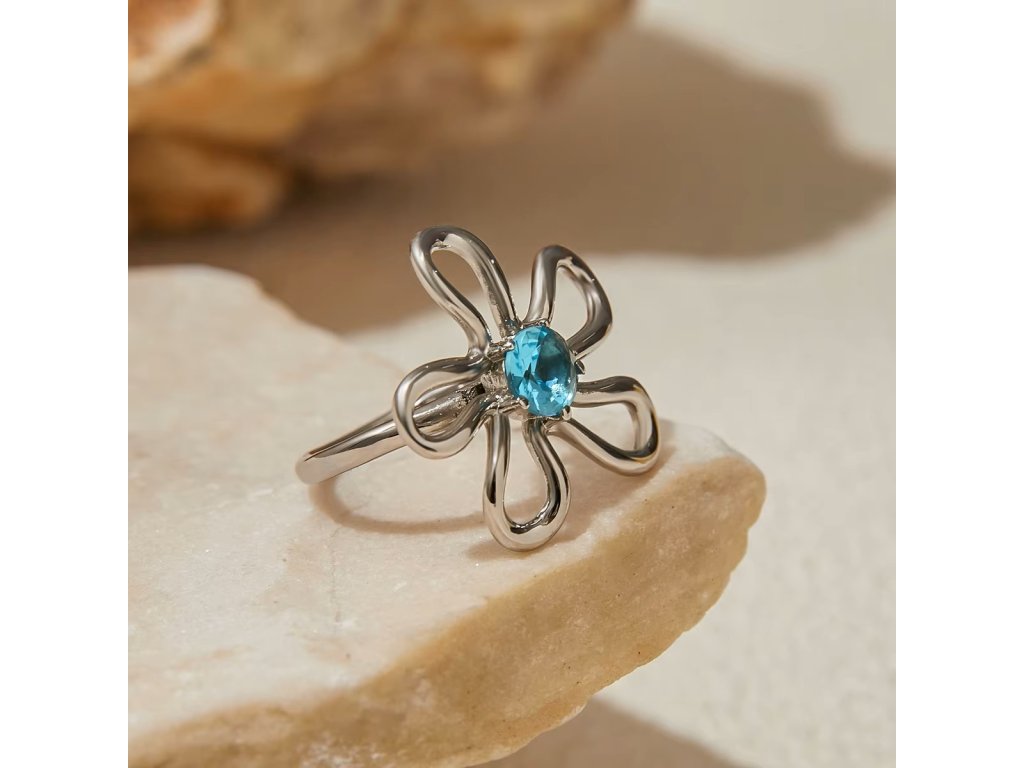 ELENYS Azure Bloom představuje rovnováhu mezi minimalismem a jemnou ženskostí. Pět otevřených okvětních lístků z lesklé chirurgické oceli obklopuje světle modrý zirkon, který připomíná ranní nebe po dešti – klidný, čistý a zářící.