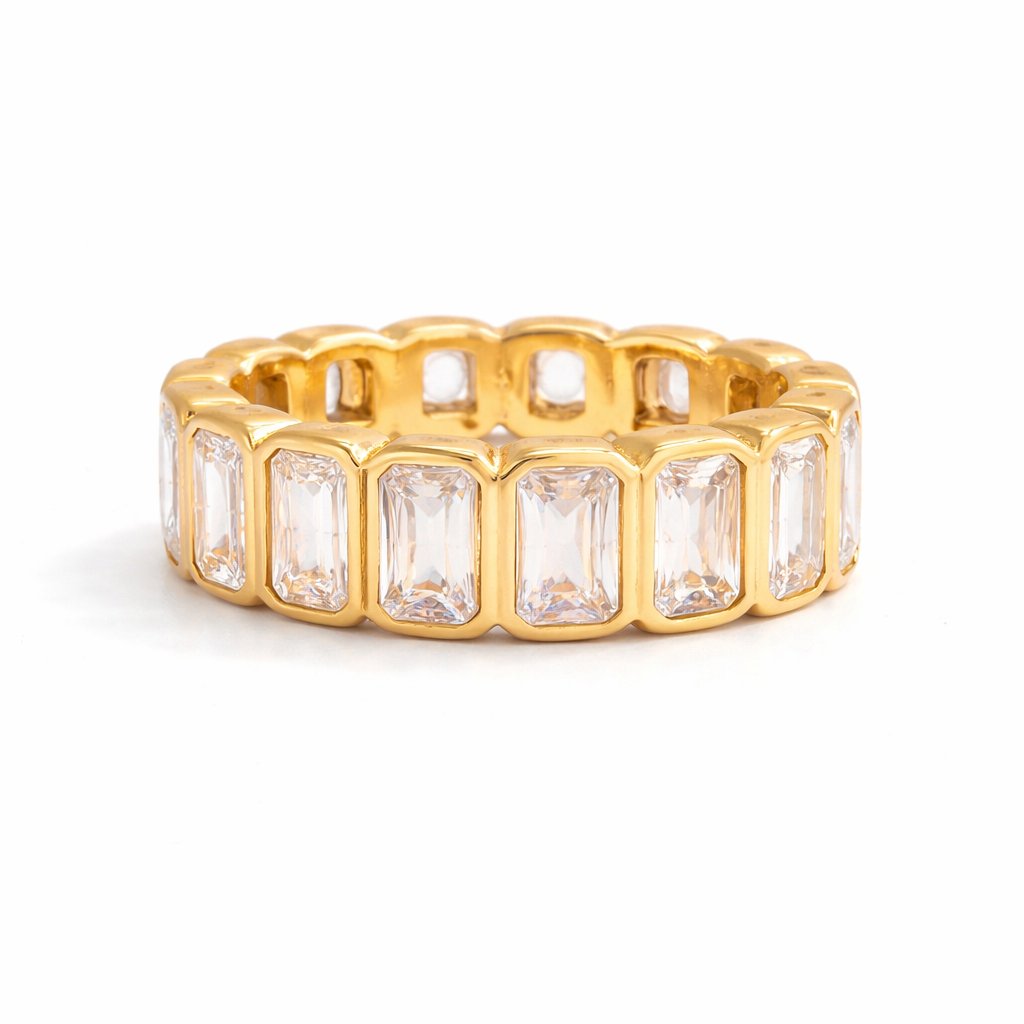 ELENYS Crystal Line tvoří souvislá linie obdélníkových zirkonů, které vytvářejí výrazný geometrický efekt. Prsten působí moderně, čistě a sebevědomě.