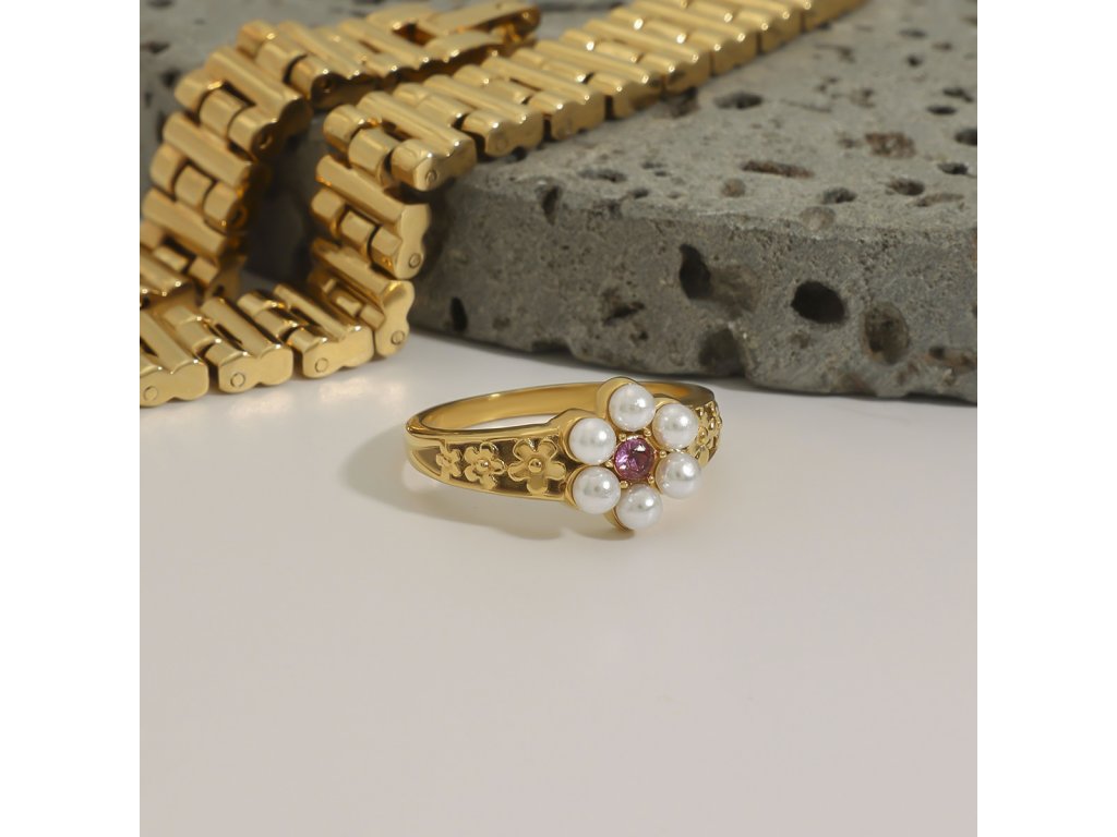 ELENYS Flower Pearl pozlacený prsten 18K žluté zlato