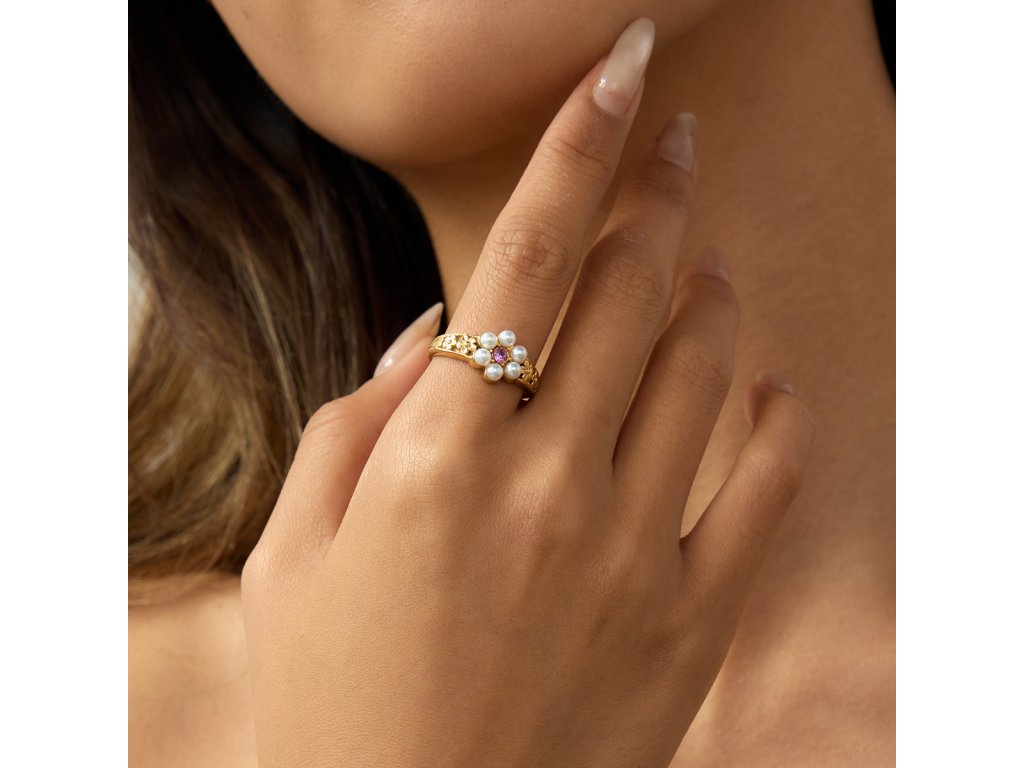Prsten ELENYS Flower Pearl působí jemně romanticky – šest perliček skládá květ a uprostřed září růžový zirkon, který dodá celku měkký nádech ženskosti. Po bocích obroučky pokračuje plastický reliéf drobných kvítků, takže šperk je zajímavý z každého úhlu, nejen shora.