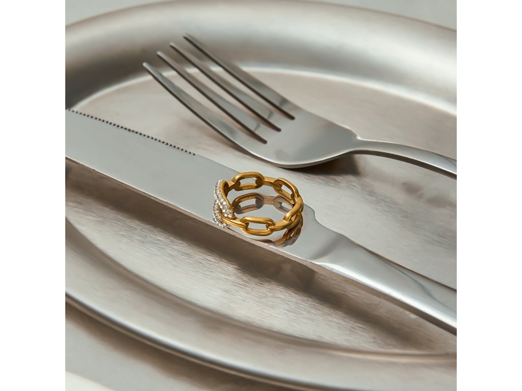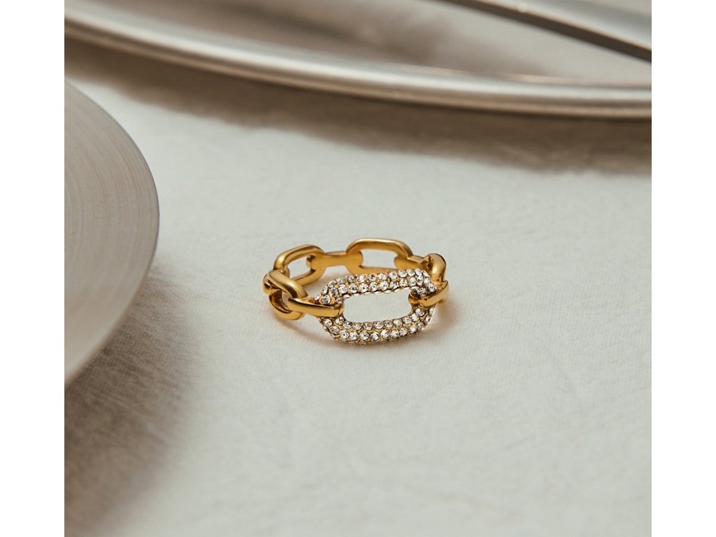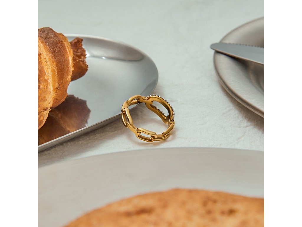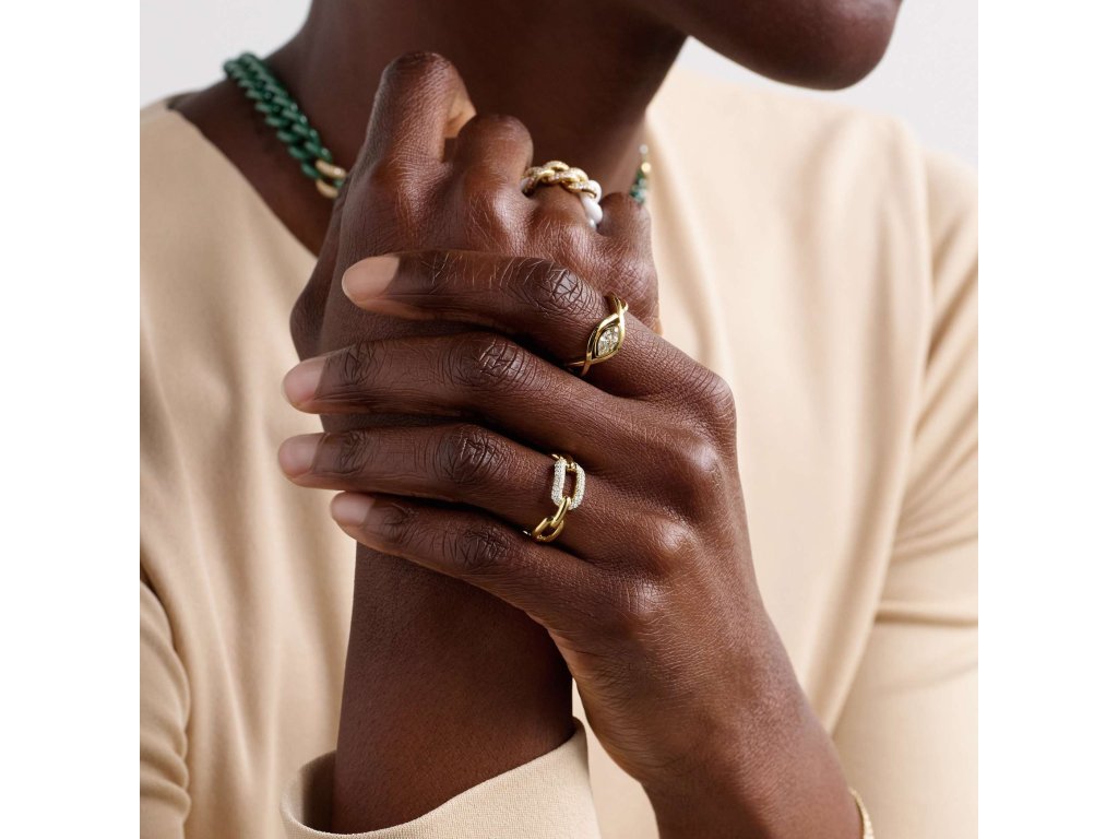 Spojení zirkonů a hladkého zlata vytváří dokonalou rovnováhu mezi elegancí a charakterem. Díky lehké konstrukci se prsten pohodlně nosí po celý den a krásně ladí s náušnicemi nebo náramky ze stejné kolekce.