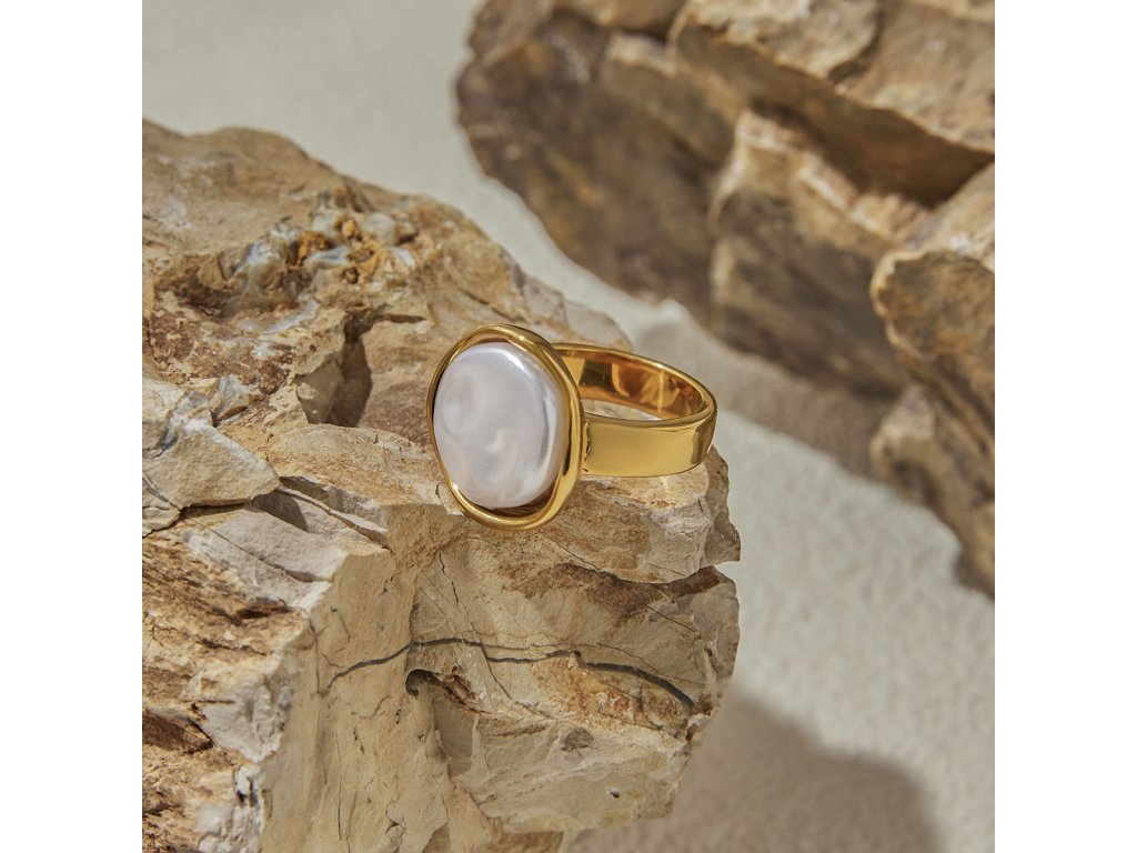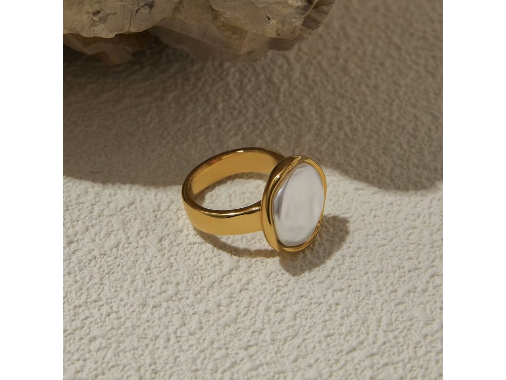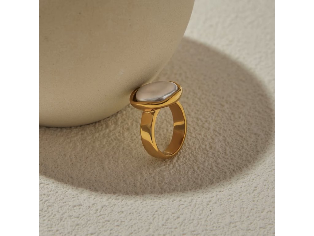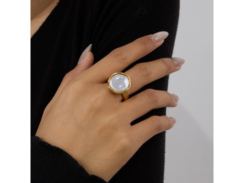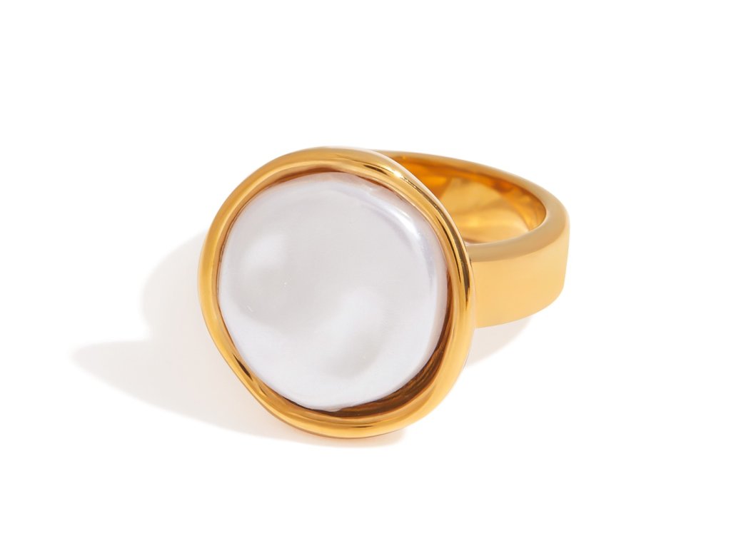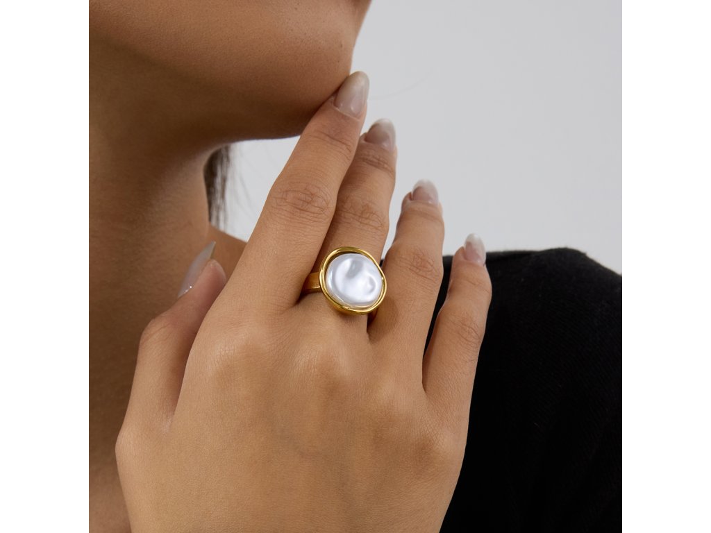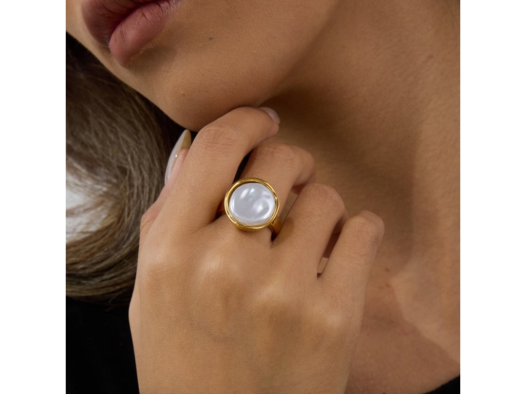 Velká bílá perlička zasazená do hladkého zlata – minimalistický prsten s jemnou přirozeností a výrazným charakterem.