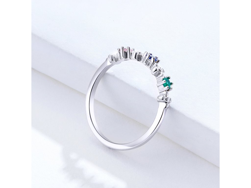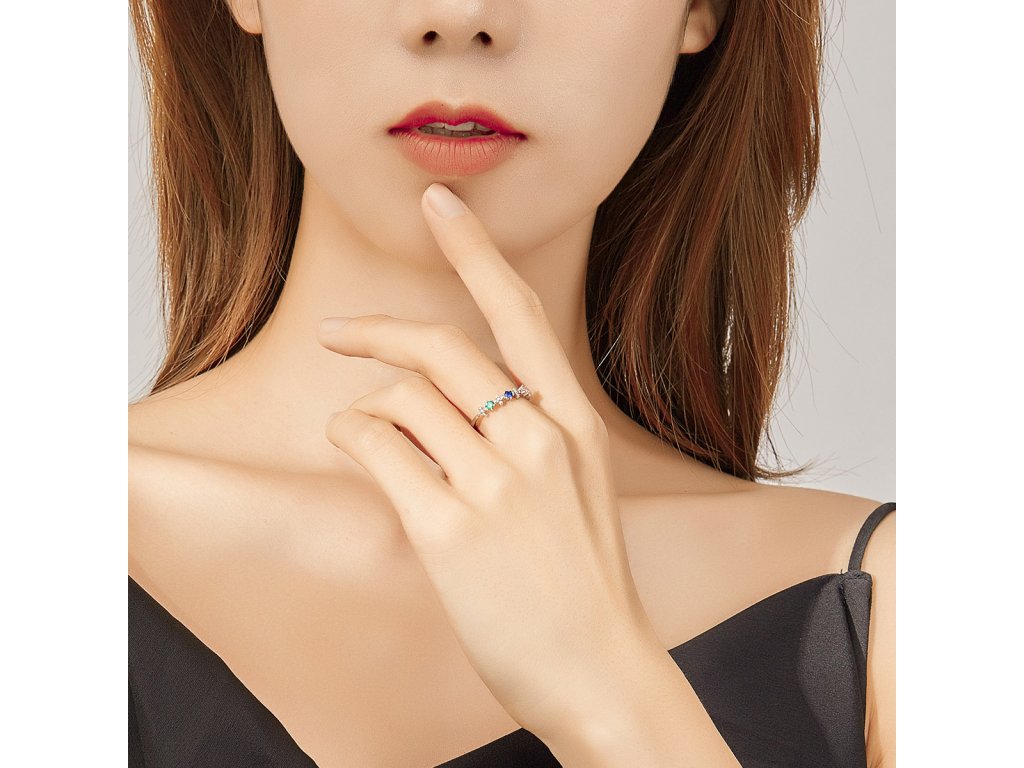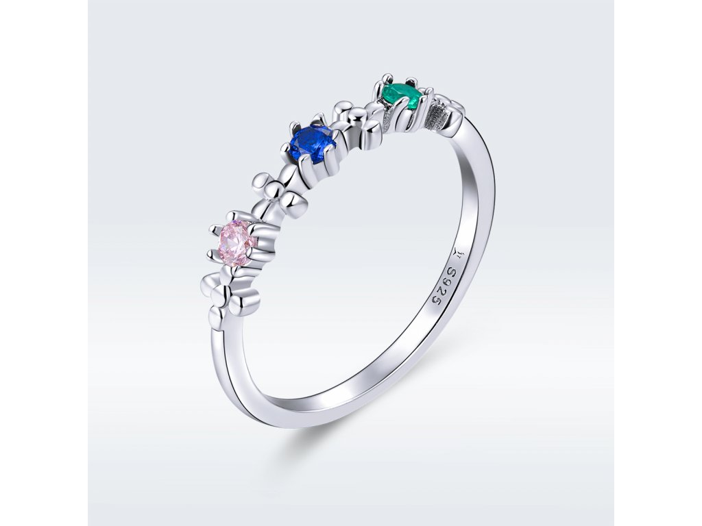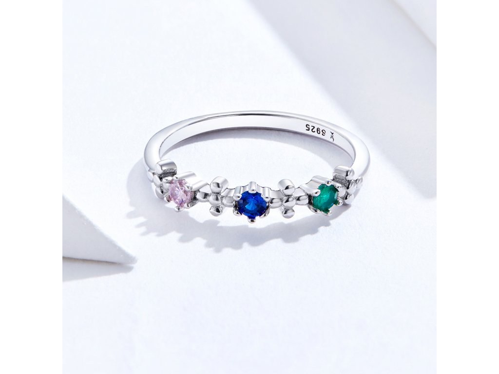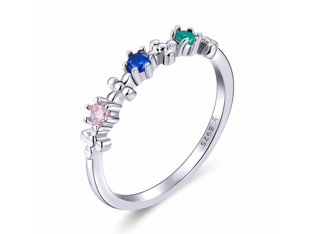 - Stříbrný propracovaný prsten v designu barevných kamenů v podobě růžového, modrého a zeleného zirkonu. Originální design prstenu, kvalitní zpracování a materiál, ručně dohotovené.