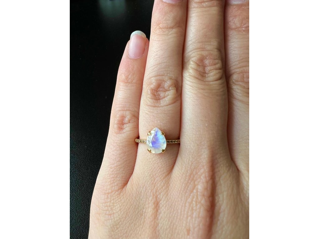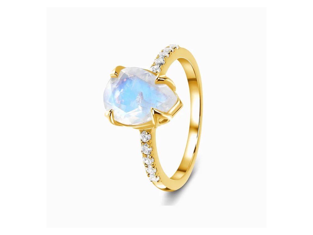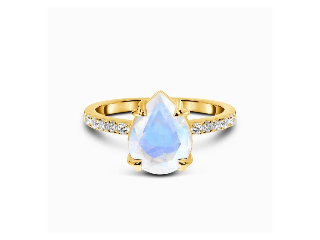 - Luxusní prsten s názvem Bohyně ze 14ti karátového žlutého zlata Vermeil obohacený měsíčním duhovým drahokamem Moonstonem ve tvaru kapky a čirými třpytivými drahokamy topazy. Originální design prstenu, kvalitní zpracování a materiál, ručně dohotovené.