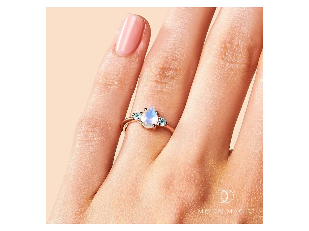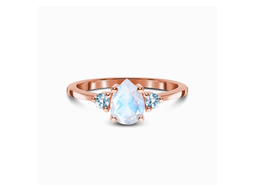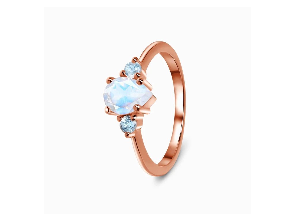 - Luxusní prsten Decentní kapka ze 14ti karátového růžového zlata Vermeil obohacený měsíčním duhovým drahokamem Moonstonem a čirými třpytivými drahokamy modrými topazy.