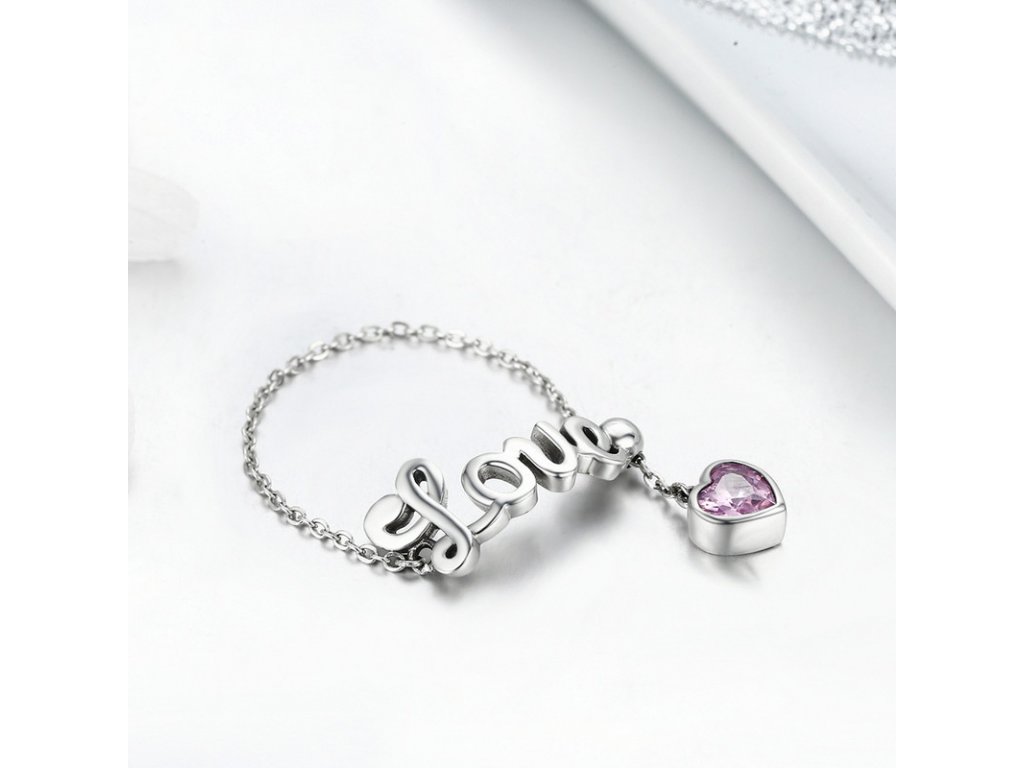 Jemný a elegantní řetízkový prsten s anglickým nápisem "Love" v překladu "Láska". Prsten je doplněn visacím přívěskem obohacený ručně posázeným třpytivým kamenem v podobě růžového zirkonu. Originální design prstenu, kvalitní zpracování a materiál, ručně dohotovené.