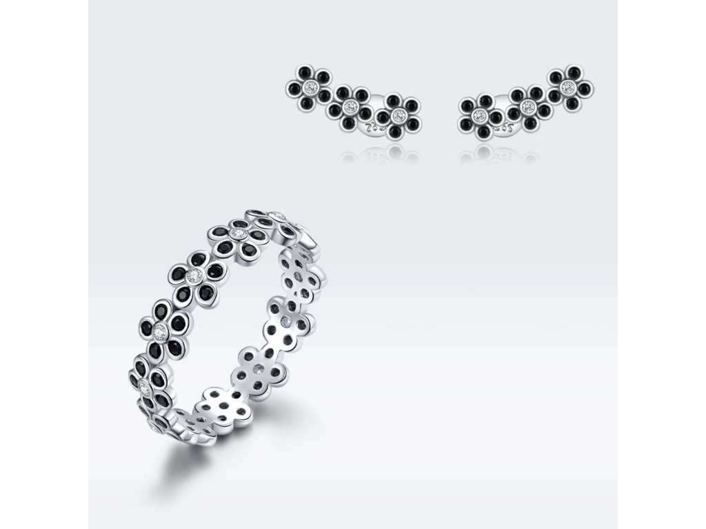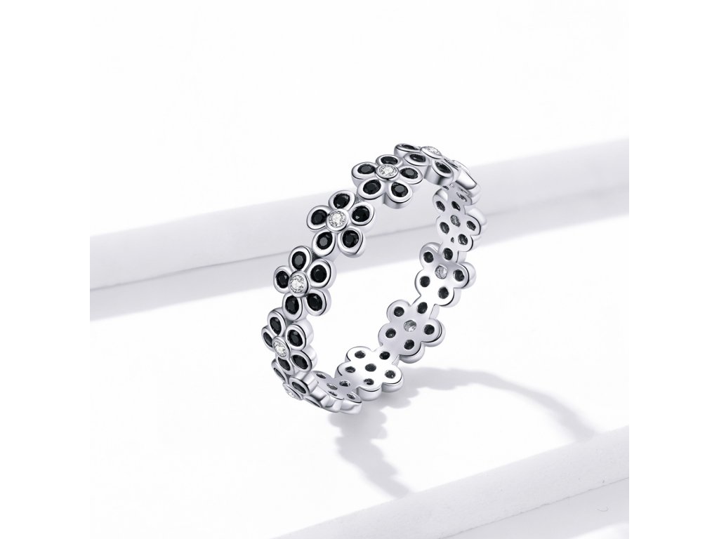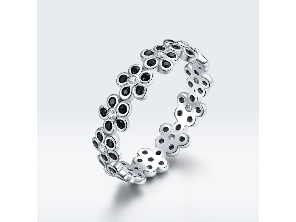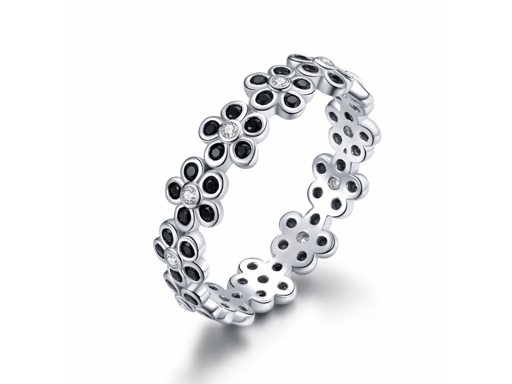 - Stříbrný prsten v designu Pole mystických květin zdobený černými a čirými třpytivými kameny v podobě třpytivých zirkonů.