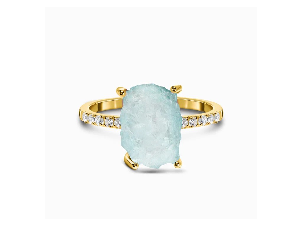- Luxusní Raw prsten ze 14ti karátového žlutého zlata Vermeil obohacený drahokamem akvamarínem a čirými třpytivými drahokamy topazy. Originální design prstenu, kvalitní zpracování a materiál, ručně dohotovené.