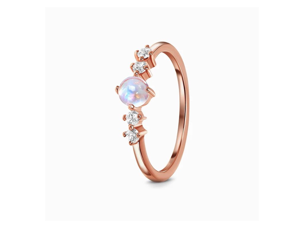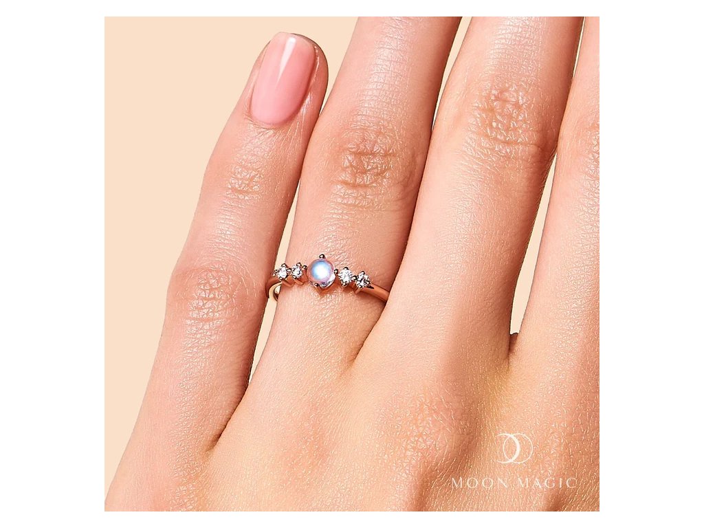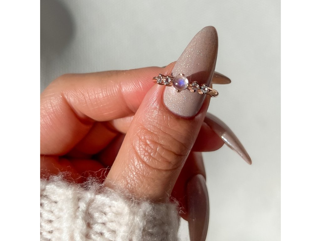 - Luxusní prsten Rozkoš ze 14ti karátového růžového zlata Vermeil obohacený měsíčním duhovým drahokamem Moonstonem a čirými třpytivými drahokamy topazy. Originální design prstenu, kvalitní zpracování a materiál, ručně dohotovené.