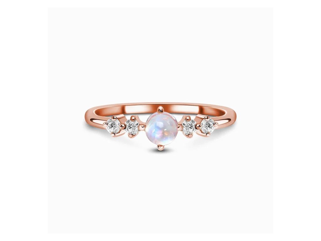 Chladná paleta prstenu Rozkoš vyzařuje klidné a sebevědomé vibrace. Náš autentický prsten s duhovým měsíčním kamenem je malý, ale nápadný a obklopený elegantní řadou bílých topazových drahokamů. Prsten je díky své jednoduchosti tak univerzální, že jej můžete nosit k jakémukoli oblečení ze svého šatníku – od bílého trička až po elegantní černé šaty.