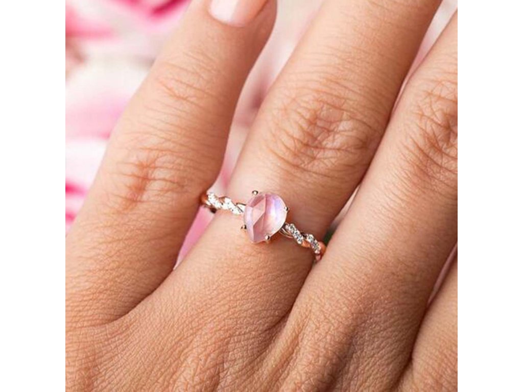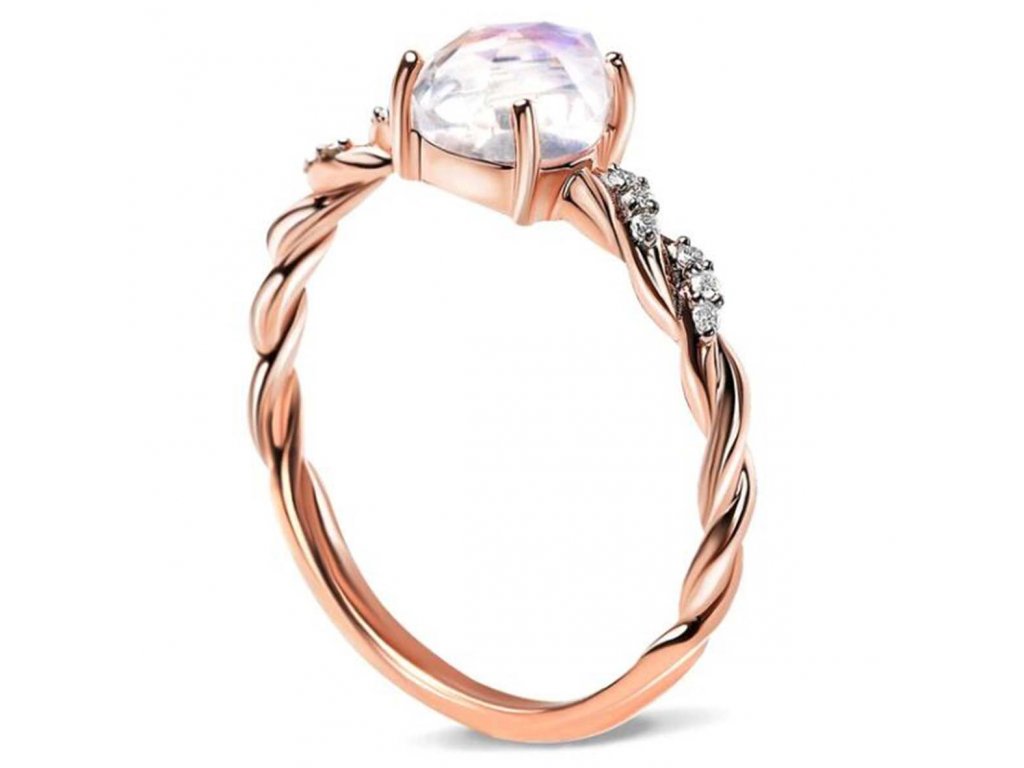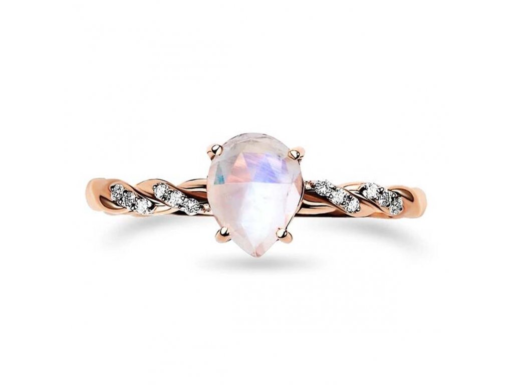 Luxusní romantický propletený prsten ze 14ti karátového růžového zlata Vermeil zdobený velkým měsíčním kamenem Moonstone a čirými třpytivými zirkony.