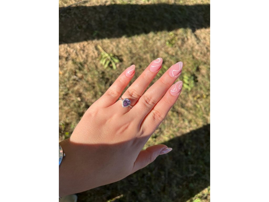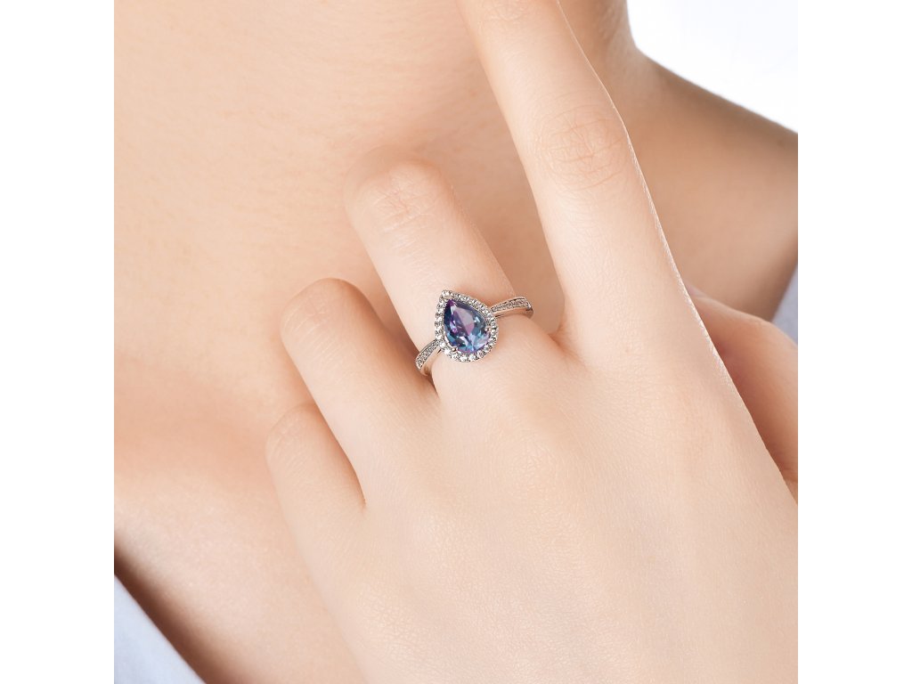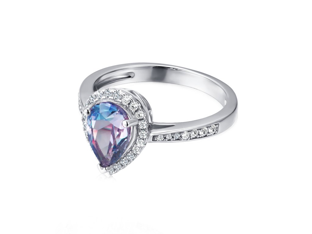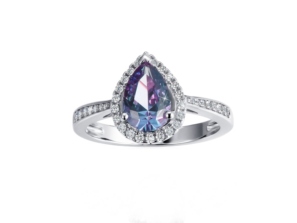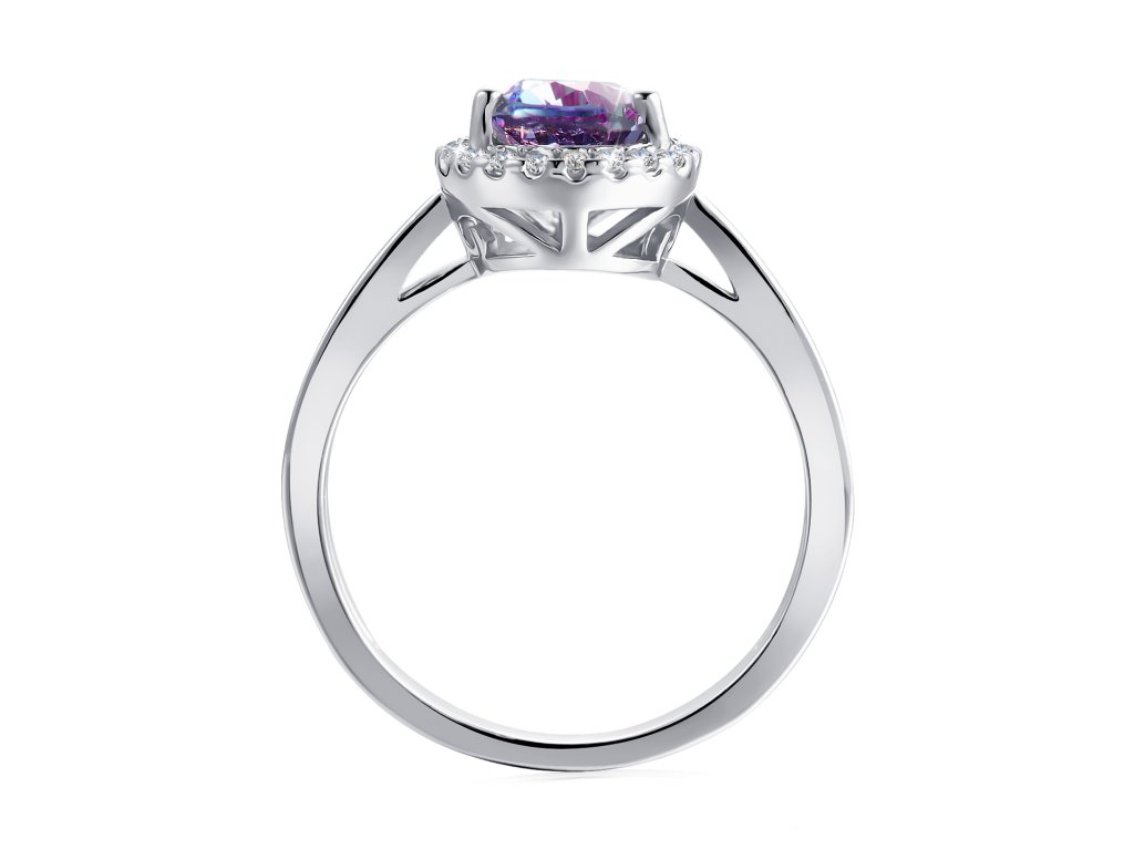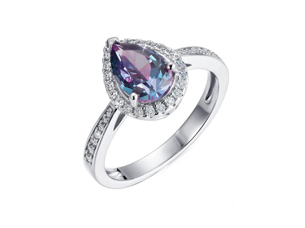 - Hypoalergení stříbrný prsten pozlacený 18 karátovým bílým zlatem zdobený Alexandritem a zirkony. Originální design prstenu, kvalitní zpracování a materiál, ručně dohotovené.
