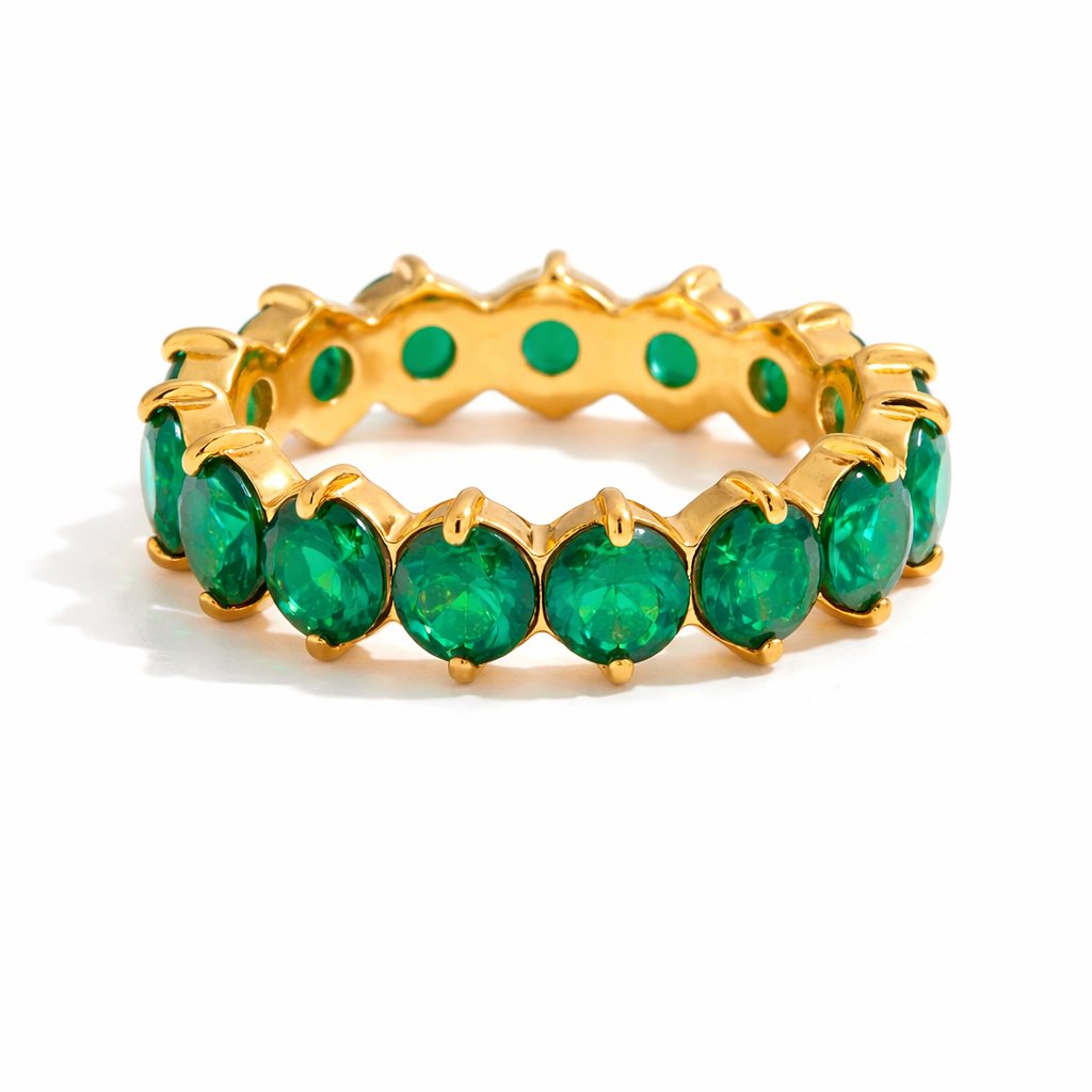 Zirkony jsou broušeny tak, aby vytvářely intenzivní třpyt a hloubku barvy, která připomíná luxusní drahé kameny. Prsten tak působí sofistikovaně a nadčasově.