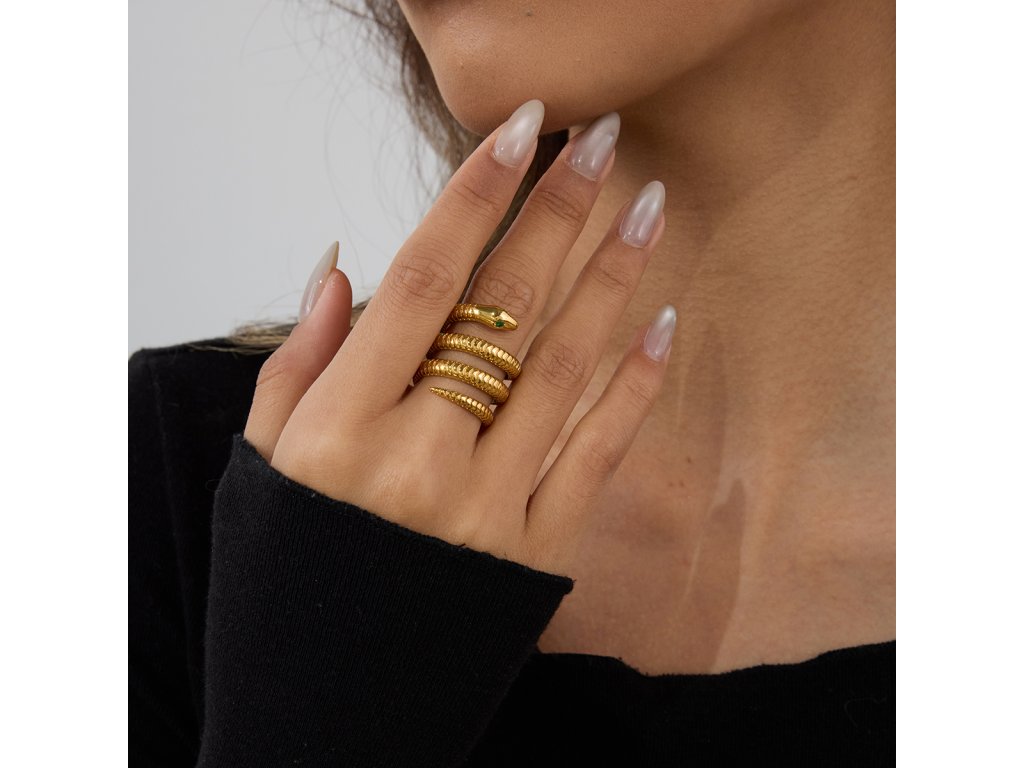 Precizní rytí zvýrazňuje texturu hadí kůže a jemně odráží světlo s každým pohybem ruky. Tvar je nastavitelný, takže prsten pohodlně obepne každý prst.