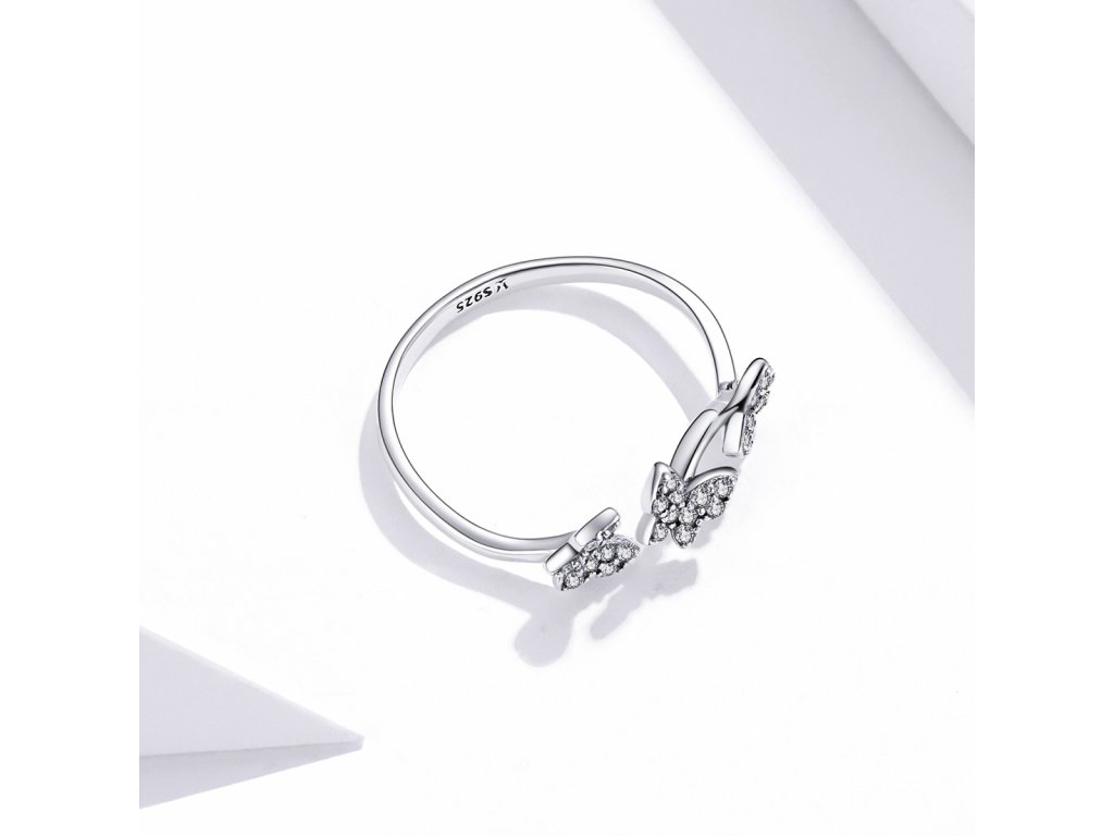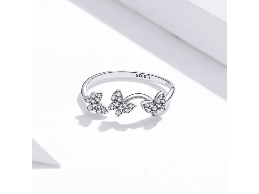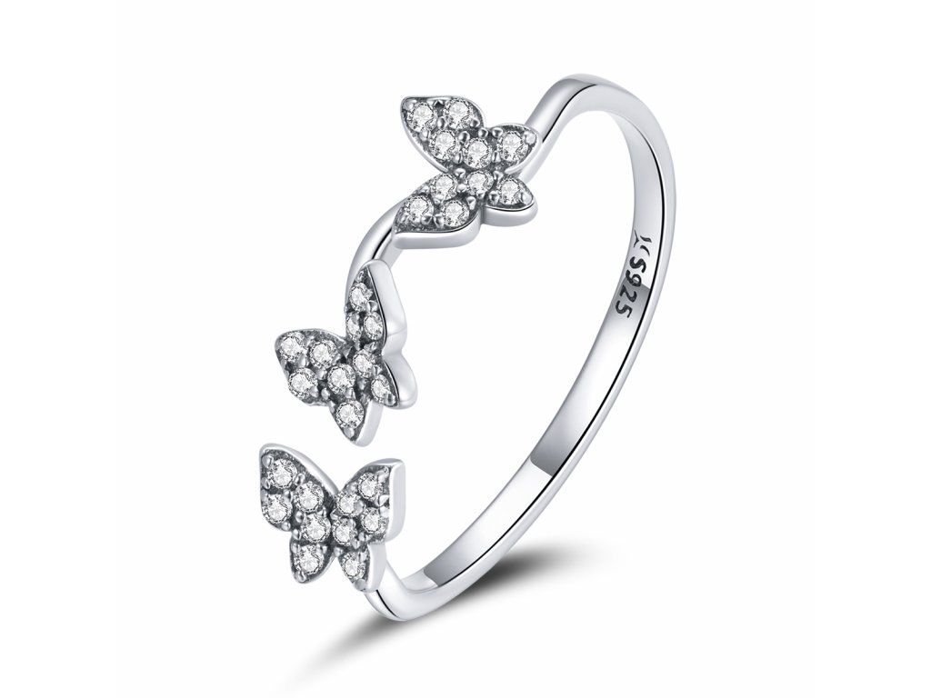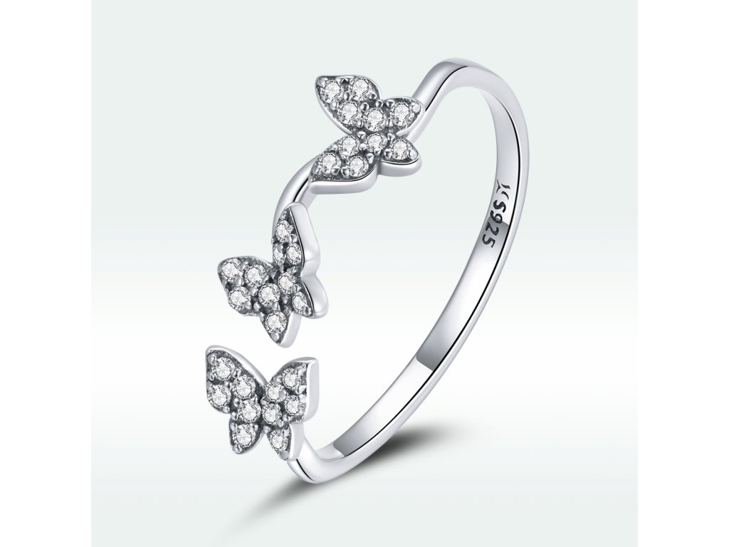 - Stříbrný nastavitelný prsten Třpytiví motýlci zdobenými čirými zirkony. Originální design prstenu, kvalitní zpracování a materiál, ručně dohotovené.