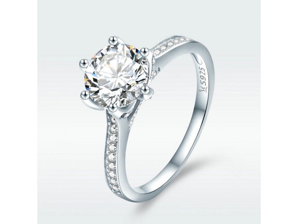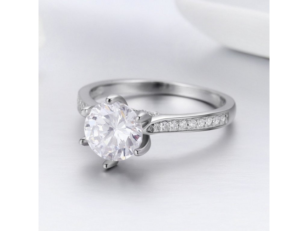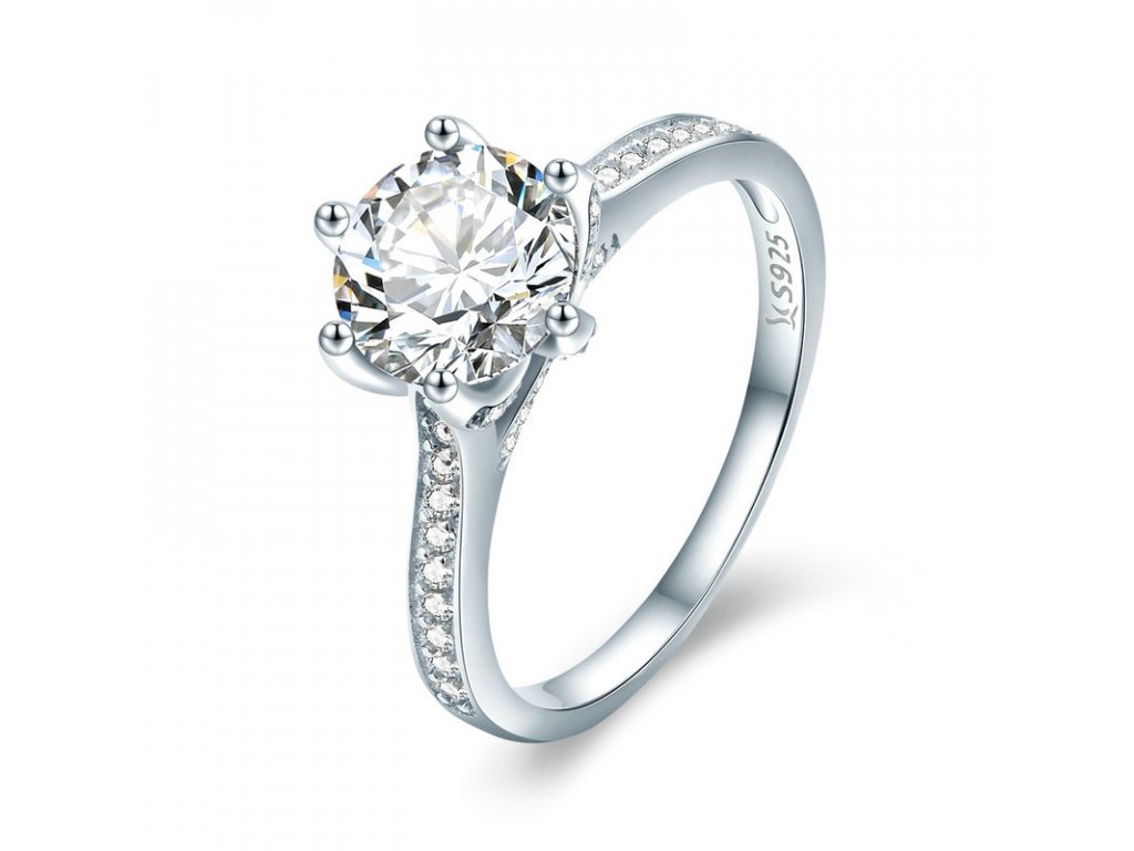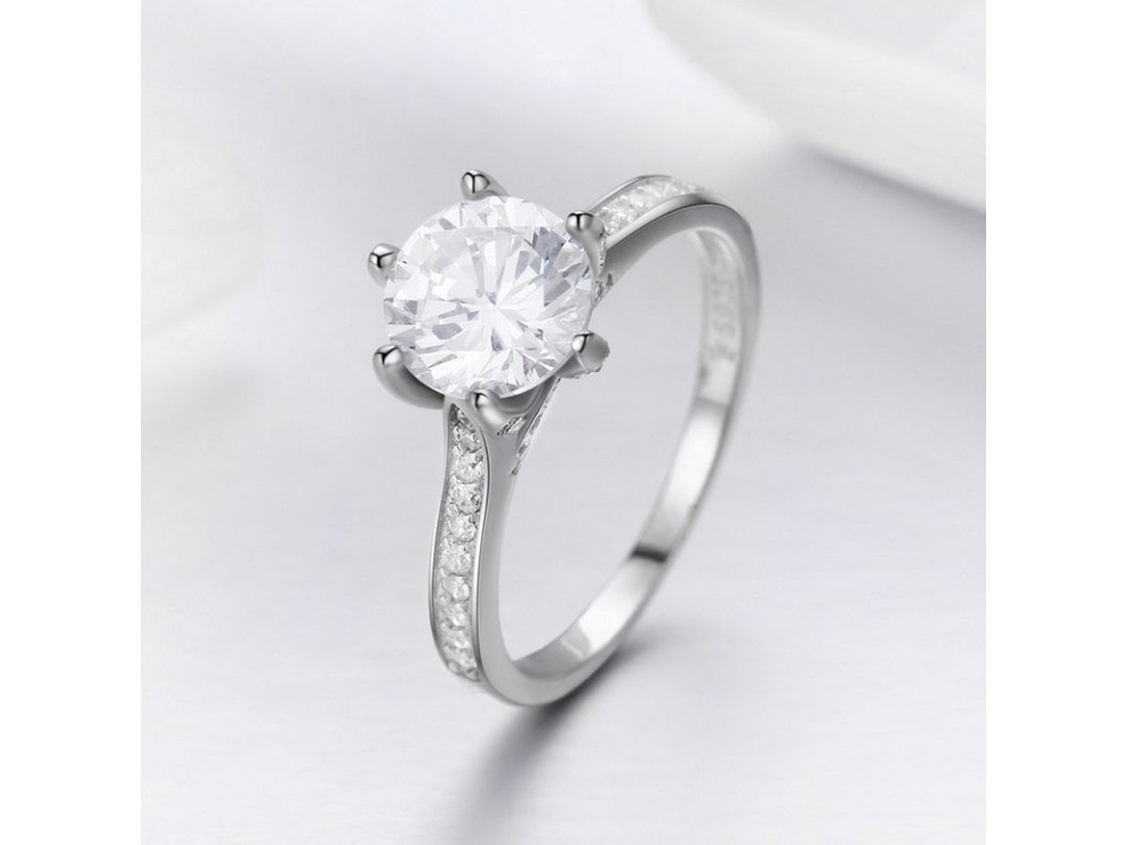 - Stříbrný prsten vyrobený z kvalitního stříbra 925/1000 a 3x platinovaný pro vyšší odolnost a lesk. Je zdobený velkým broušeným čirým zirkonem a ručně osázenými čirými zirkony po stranách.