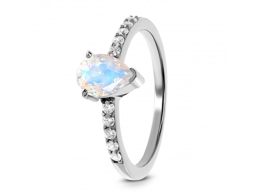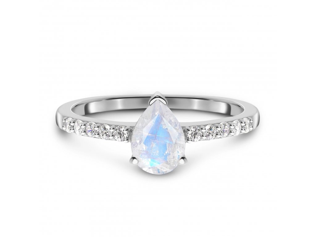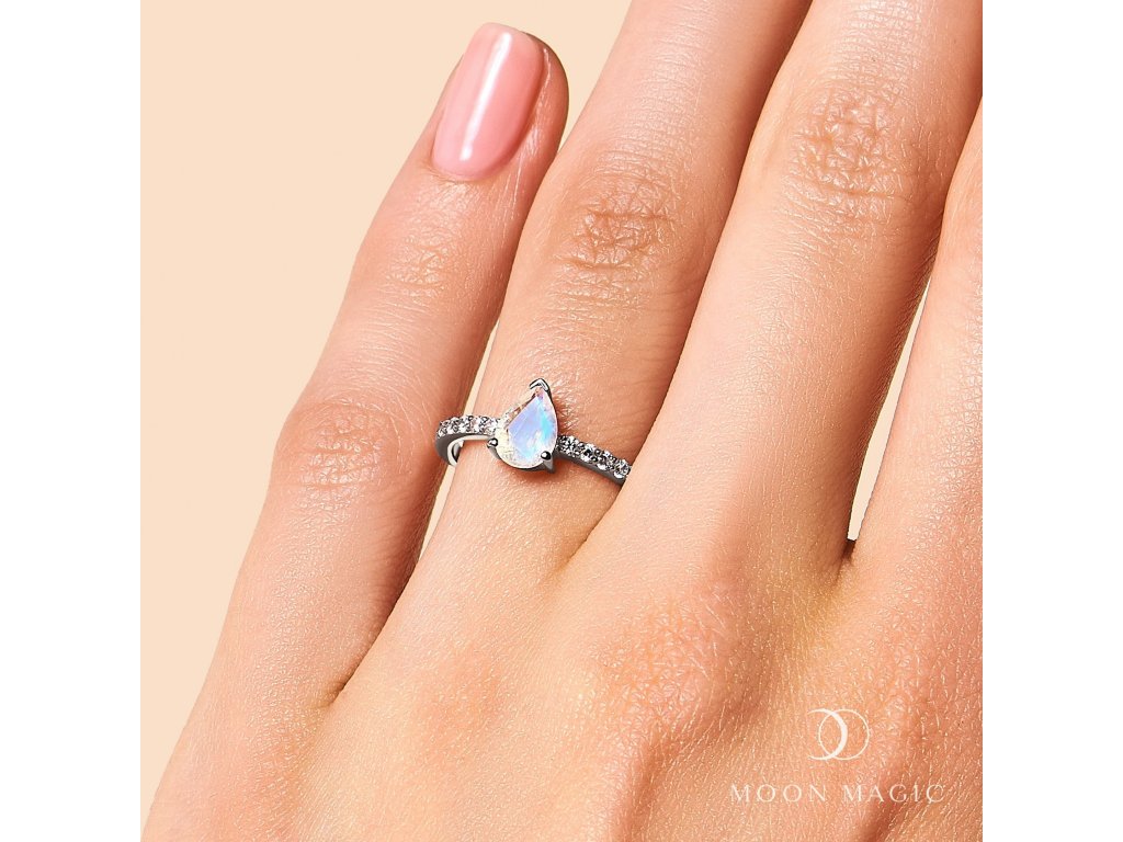 Luxusní romantický stříbrný prsten zdobený decentním měsíčním kamenem ve tvaru kapky