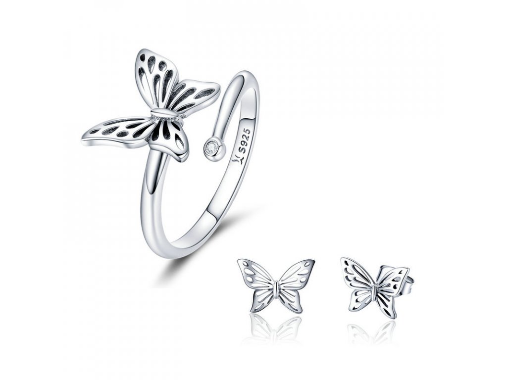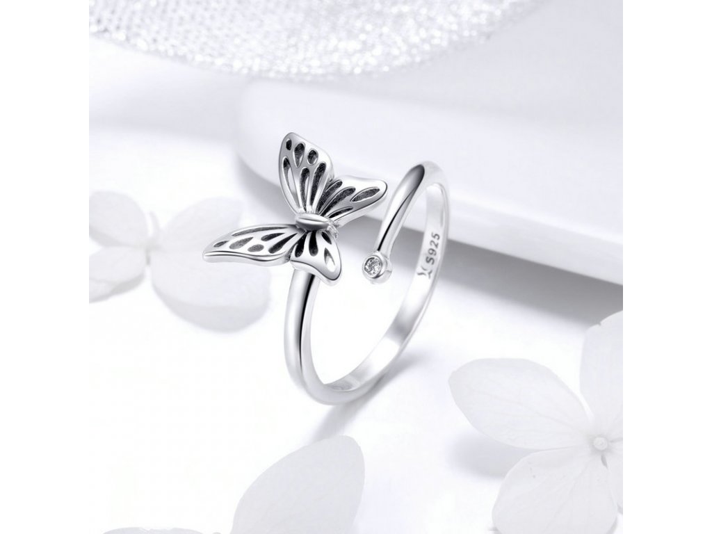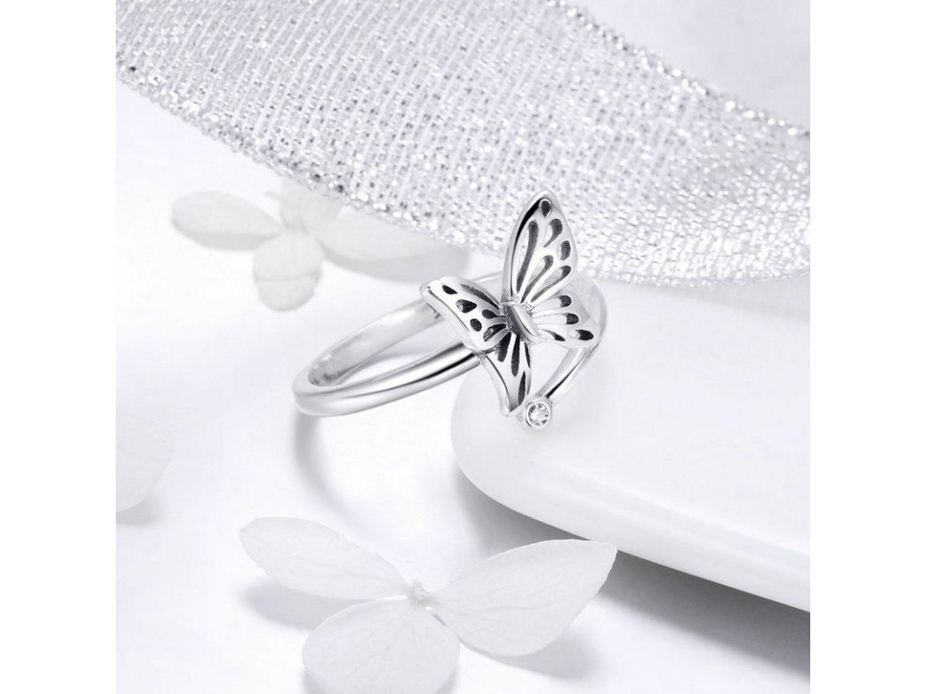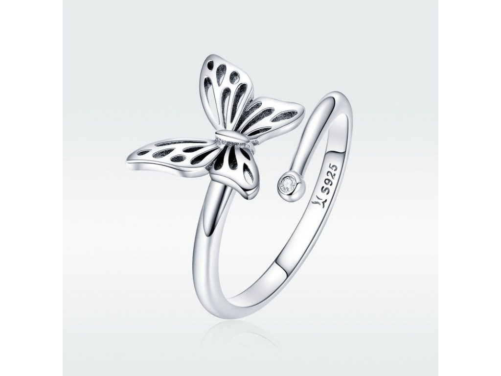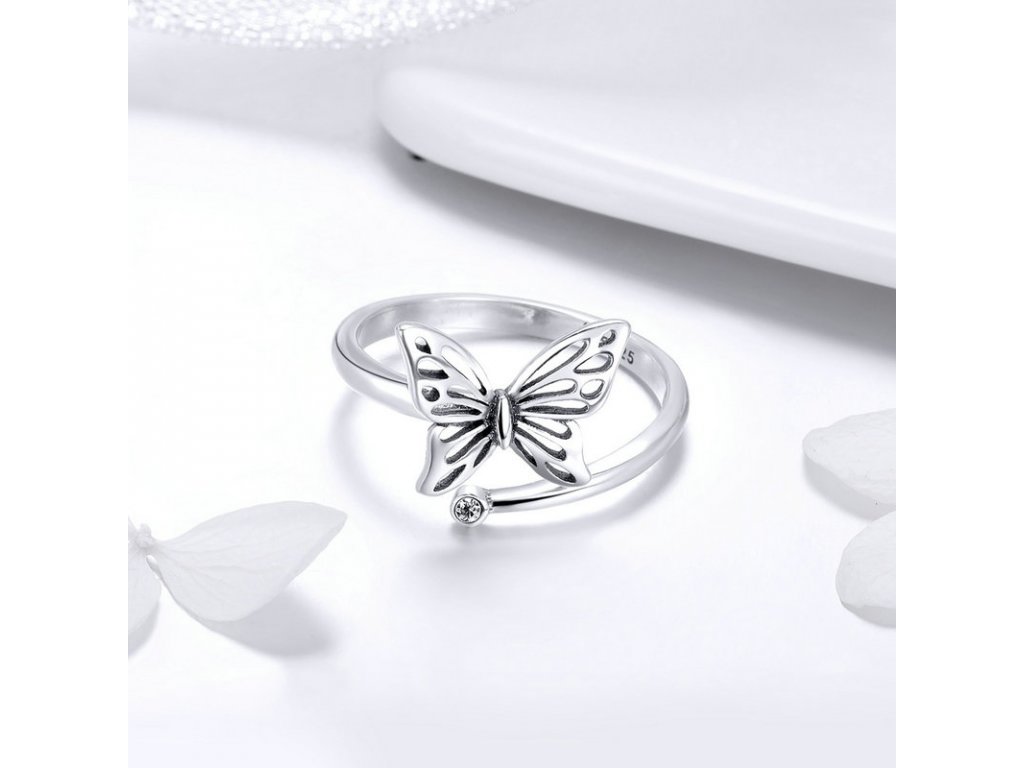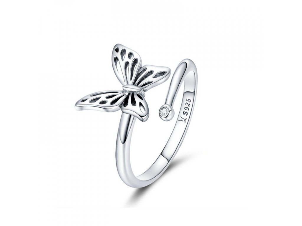 - Propracovaný stříbrný prsten v designu filigranového motýlka zdobený zirkonem.