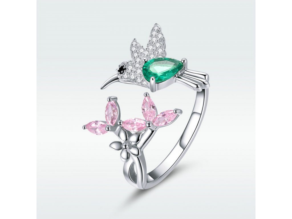 - Luxusní a propracovaný stříbrný prsten v designu kolibřík v královské zahradě zdobený zářivými barevnými zirkony. Originální design prstenu, kvalitní zpracování a materiál, ručně dohotovené.