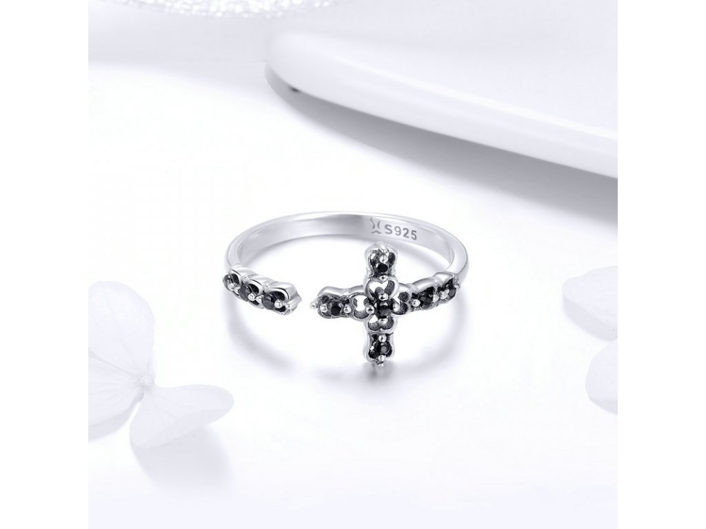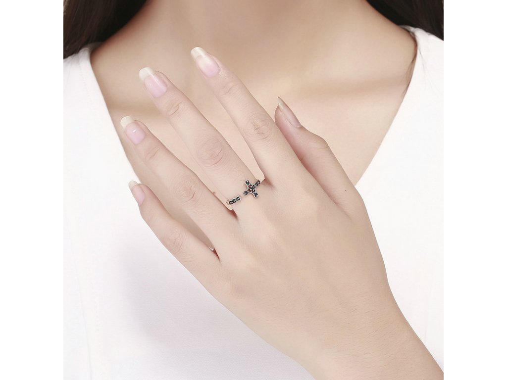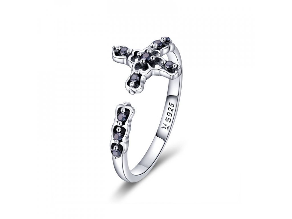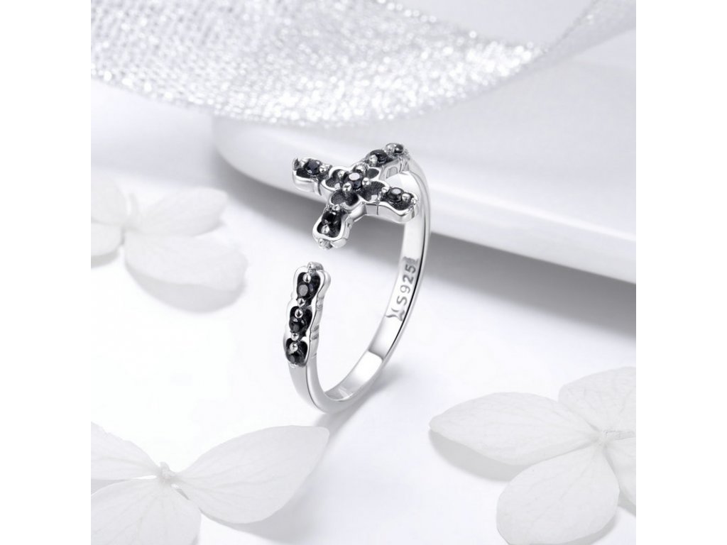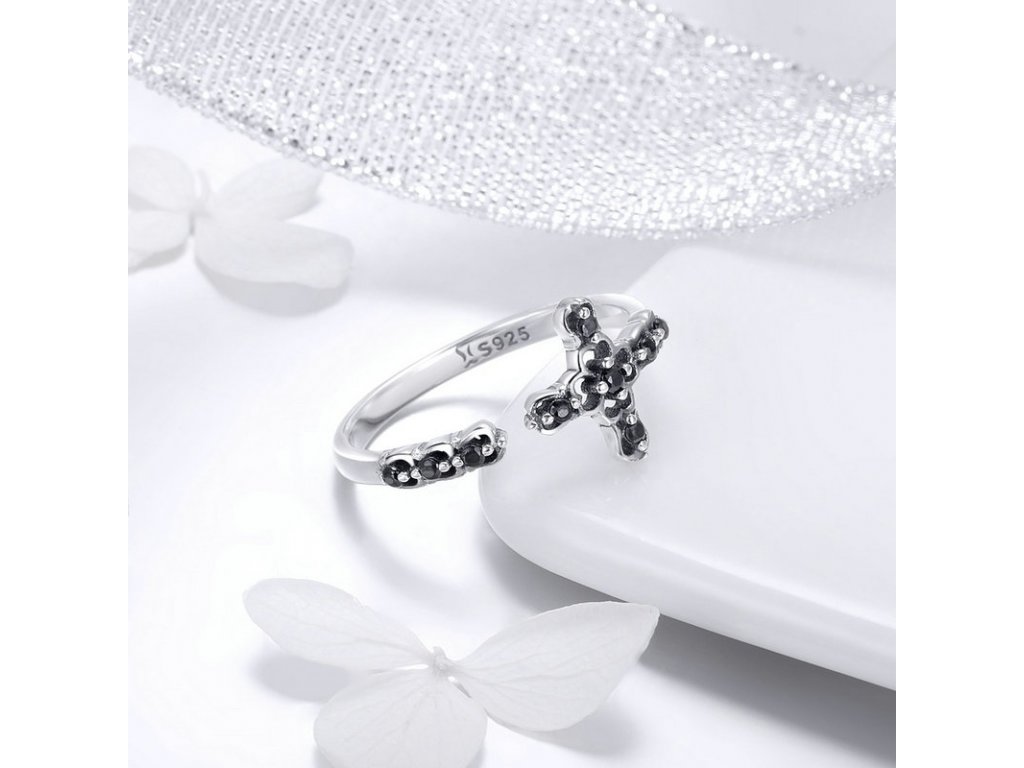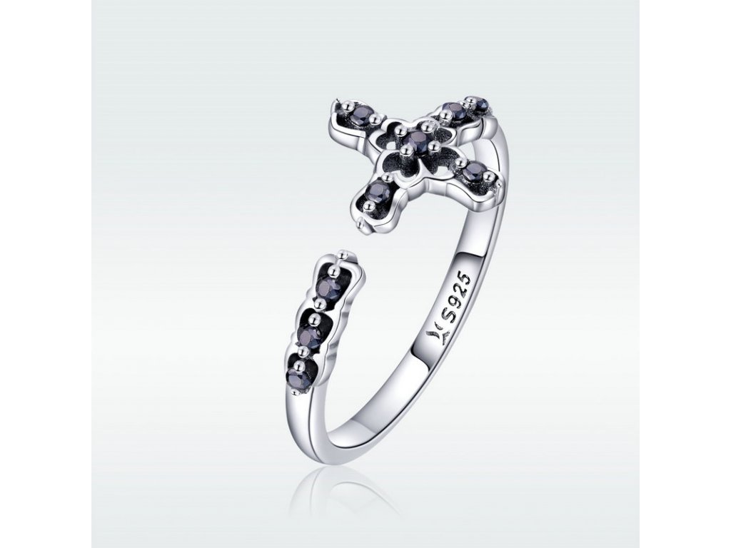 - Luxusní a propracovaný stříbrný prsten v designu křížku zdobený zirkony.