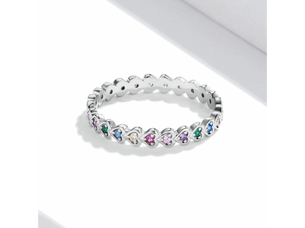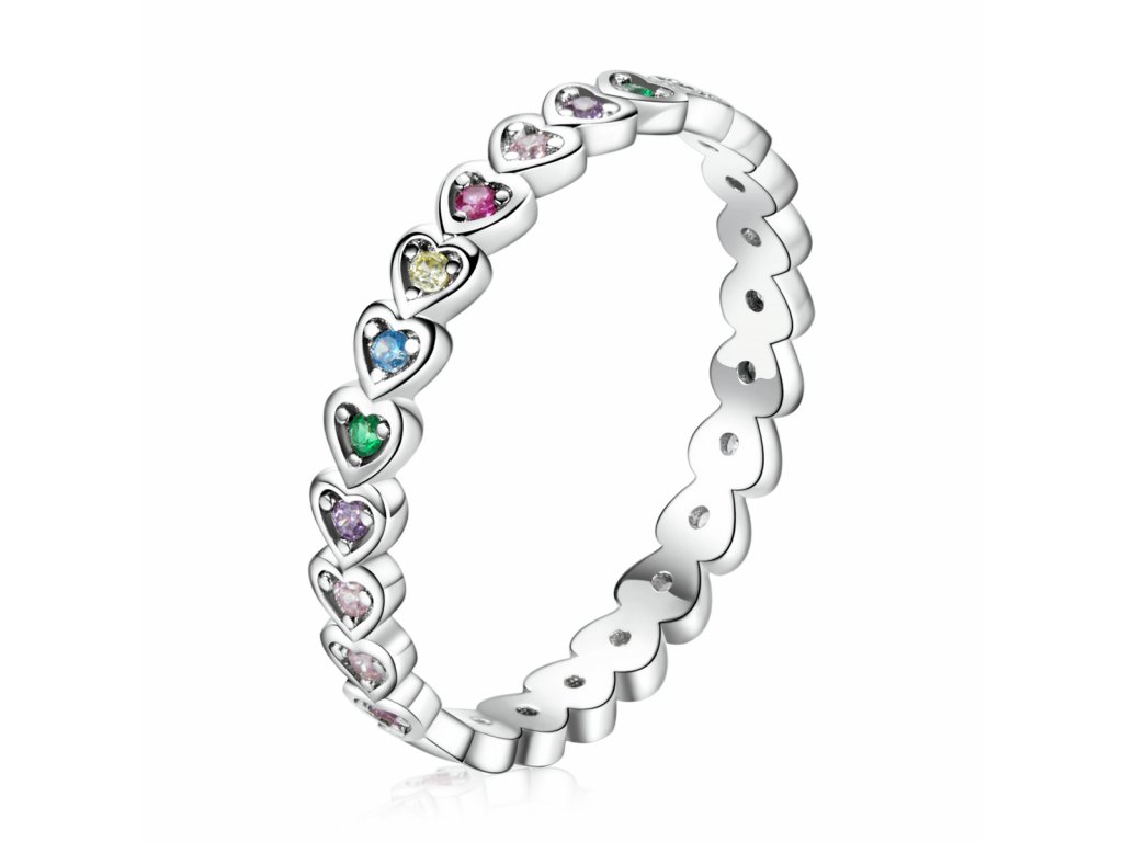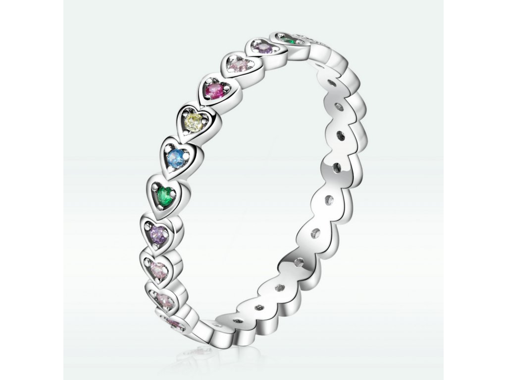 - Stříbrný prsten v designu Pole milovaných srdcí zdobených barevnými srdíčky v podobě třpytivých zirkonů. Originální design prstenu, kvalitní zpracování a materiál, ručně dohotovené.