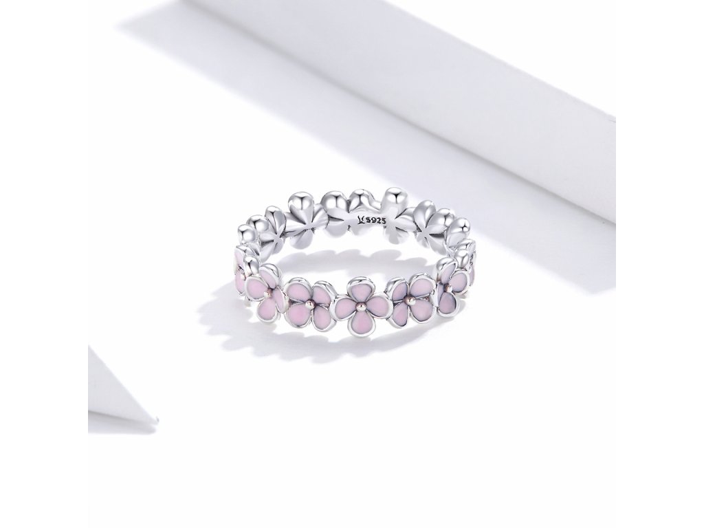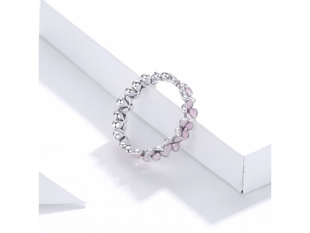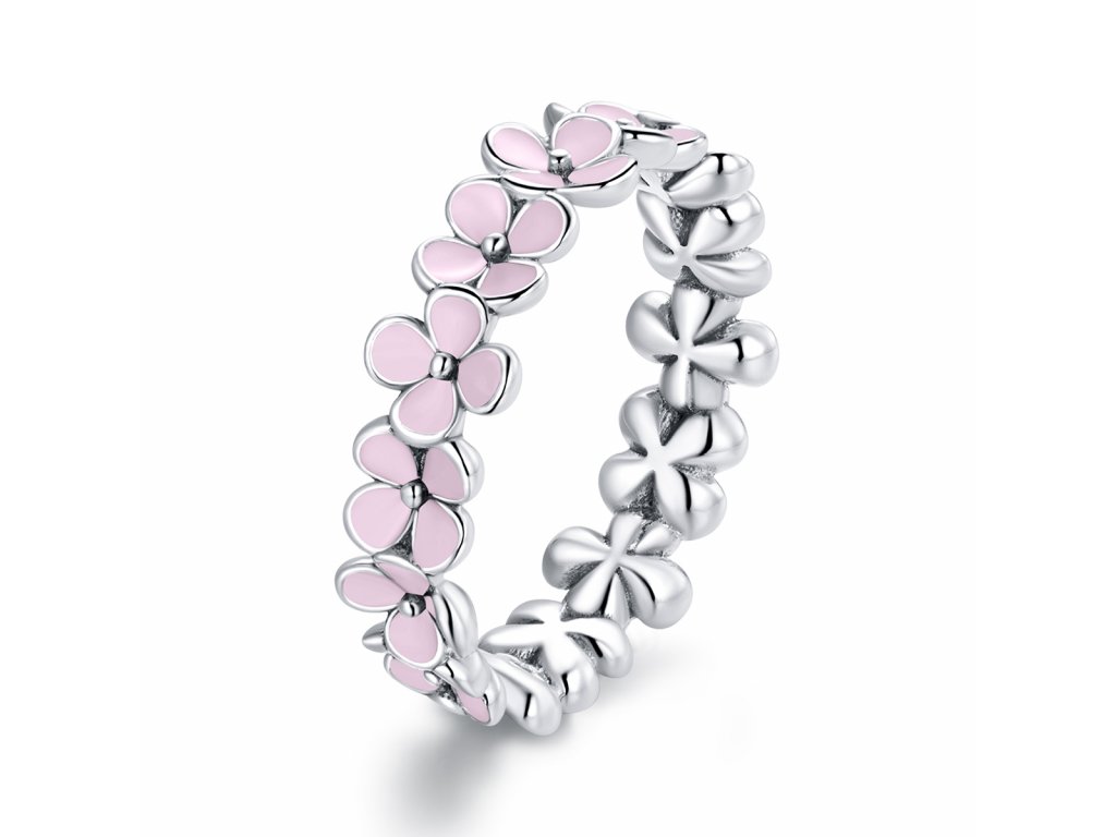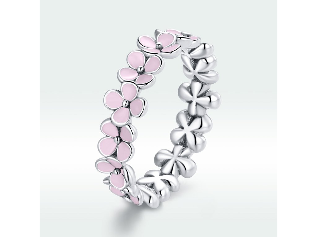 - Stříbrný prsten v designu krásných květin zdobených ručně nanášenou světle růžovou glazurou. Originální design prstenu, kvalitní zpracování a materiál, ručně dohotovené.