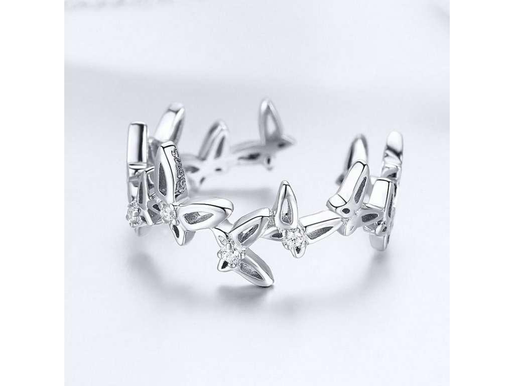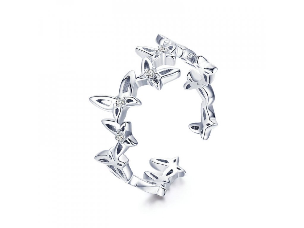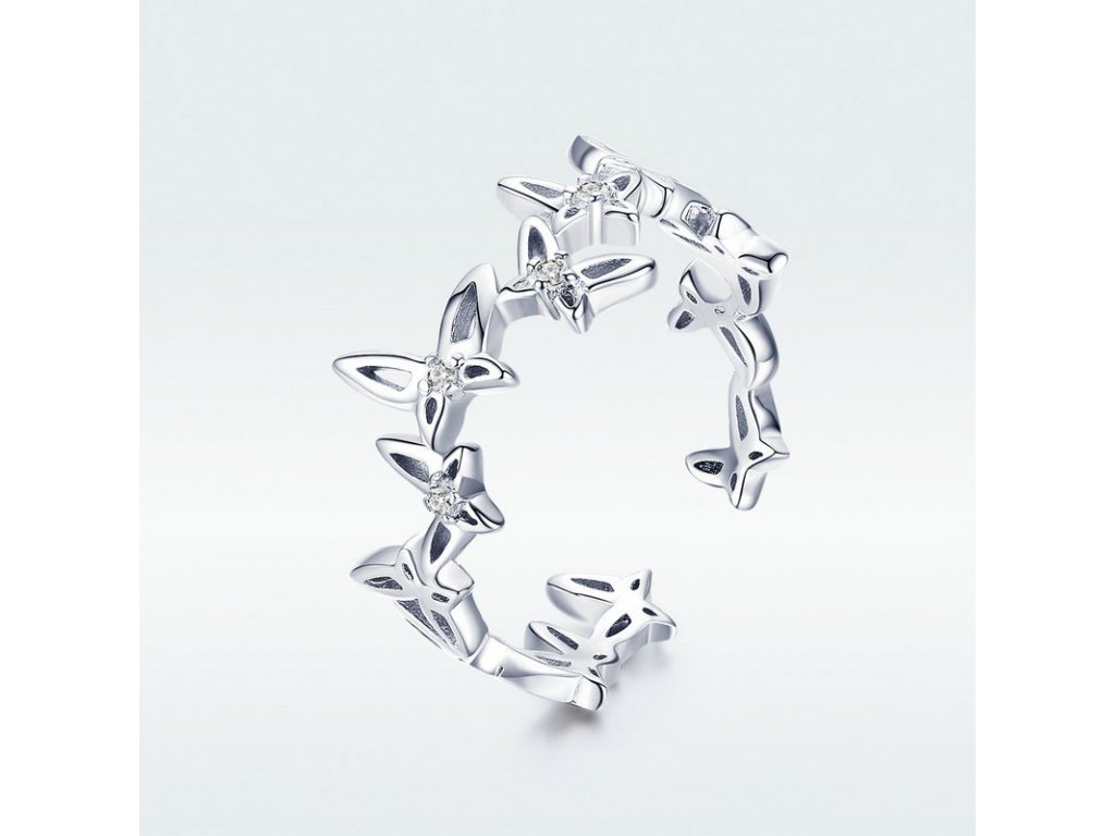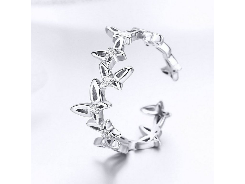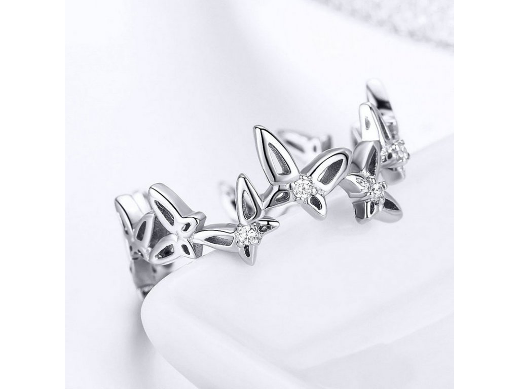 - Luxusní stříbrný prsten se zirkony v designu poletujících motýlků zdobených jemnými čirými zirkony. Originální design prstenu, kvalitní zpracování a materiál, ručně dohotovené.