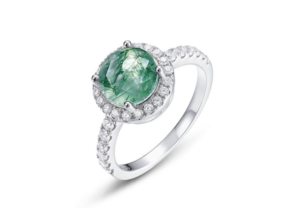 Objevte kouzlo přírody s tímto stříbrným rhodiovaným prstenem s mechovým achátem a dopřejte si šperk, který podtrhne vaši jedinečnost a styl.