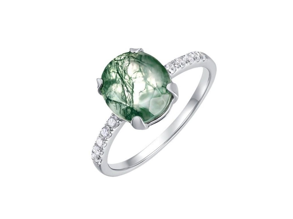 Objevte kouzlo přírody s tímto stříbrným rhodiovaným prstenem s mechovým achátem a dopřejte si šperk, který podtrhne vaši jedinečnost a styl.