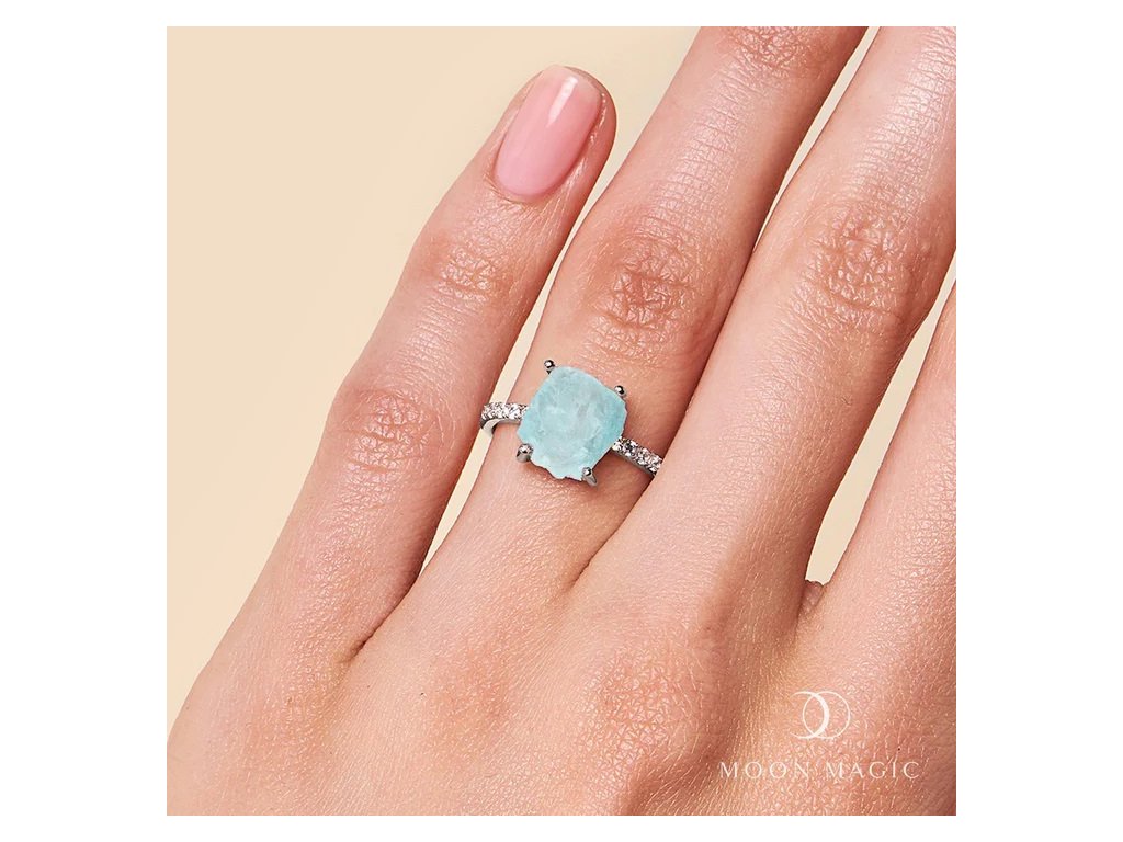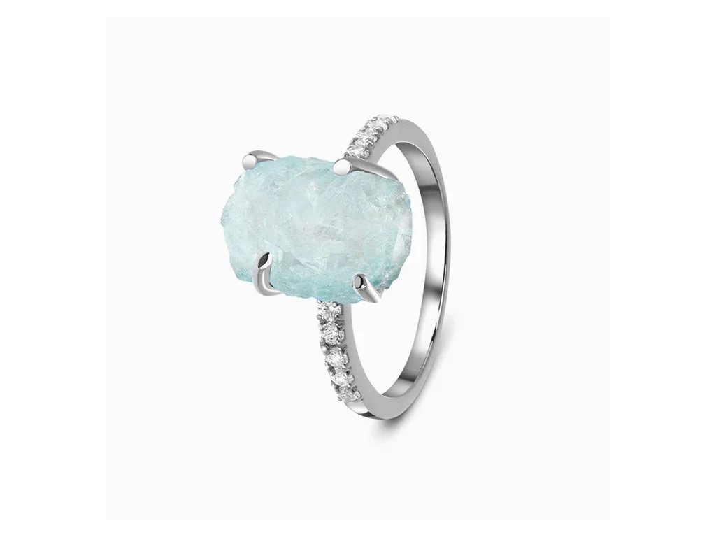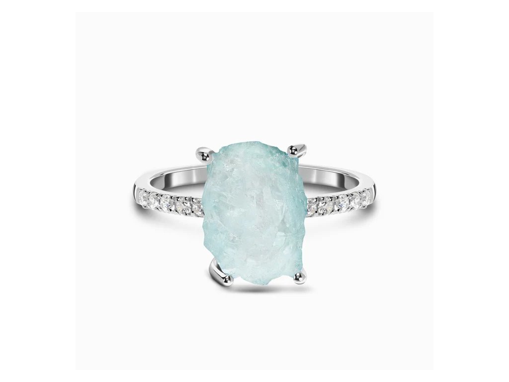- Luxusní stříbrný rhodiovaný Raw prsten obohacený drahokamem Akvamarínem a čirými třpytivými drahokamy topazy. Originální design prstenu, kvalitní zpracování a materiál, ručně dohotovené.