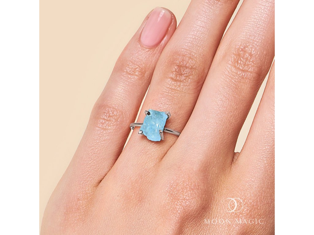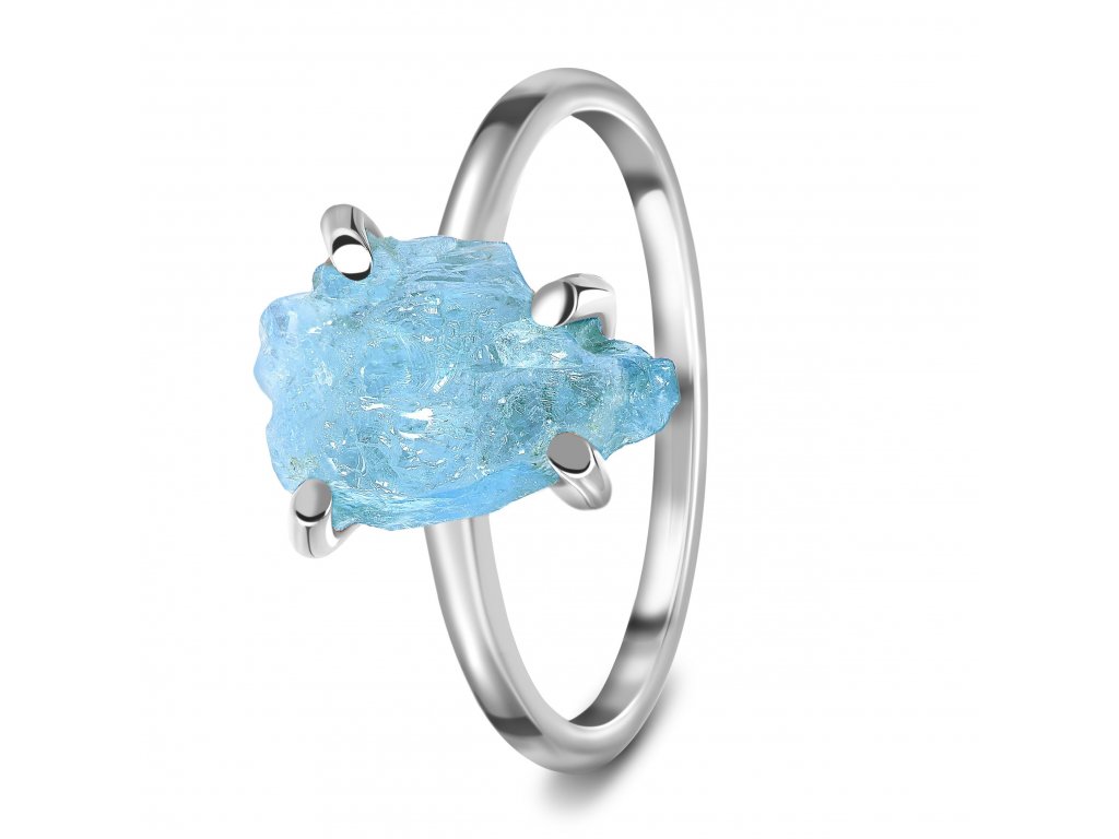 Luxusní romantický prsten ze stříbra ryzosti 925/1000 zdobený velkým neopracovaným akvamarínem.