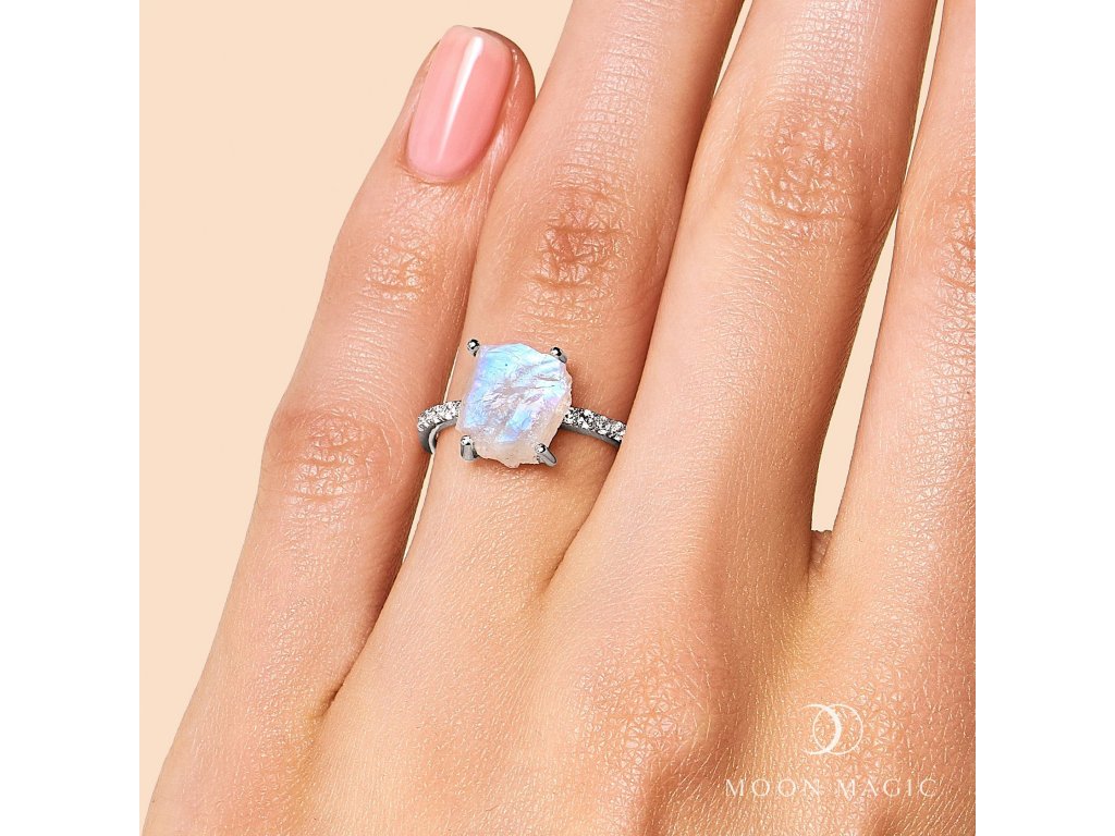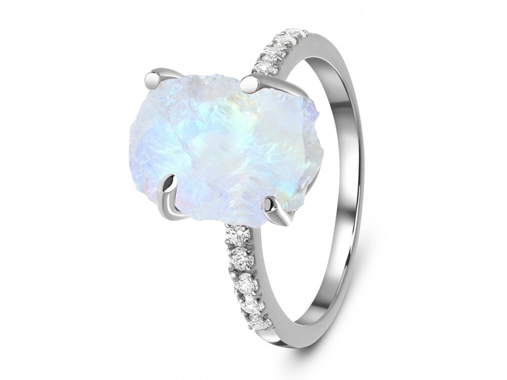 Luxusní romantický prsten ze stříbra ryzosti 925/1000 zdobený velkým neopracovaným měsíčním kamenem a topazy.