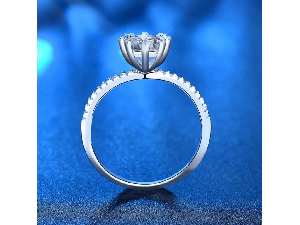 • Stříbrný rhodiovaný prsten zdobený zářivým drahokamem moissanitem a okolními třpytivými zirkony. Originální design prstenu, kvalitní zpracování a materiál, ručně dohotovené.