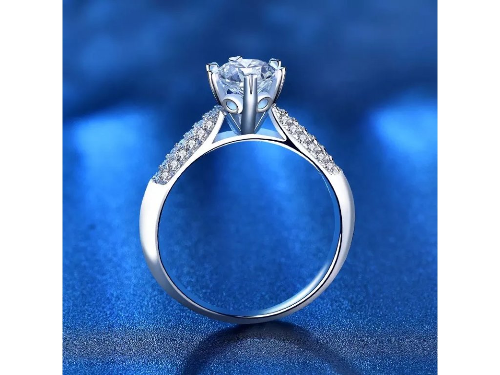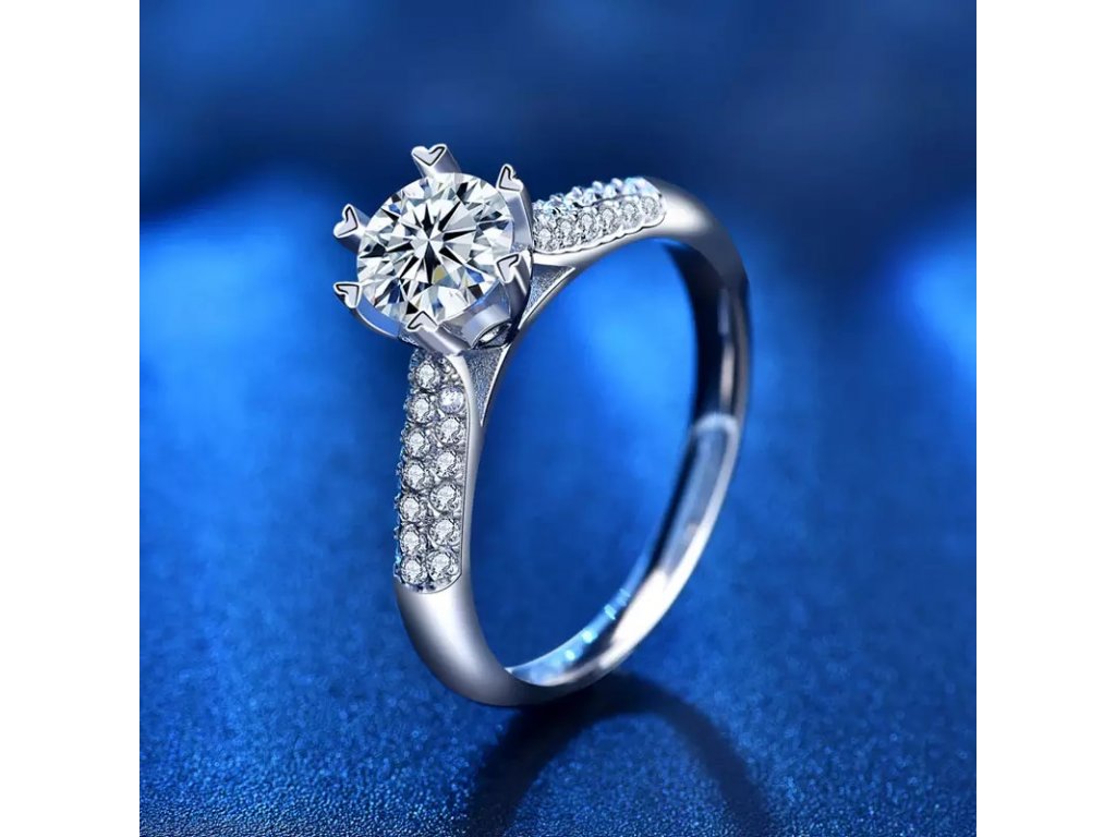 • Stříbrný rhodiovaný prsten zdobený zářivým drahokamem moissanitem a okolními třpytivými zirkony. Originální design prstenu, kvalitní zpracování a materiál, ručně dohotovené.