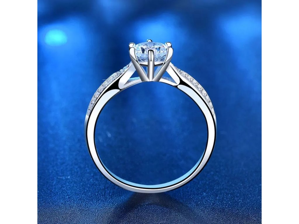 • Stříbrný rhodiovaný prsten zdobený zářivým drahokamem moissanitem a okolními třpytivými zirkony. Originální design prstenu, kvalitní zpracování a materiál, ručně dohotovené.