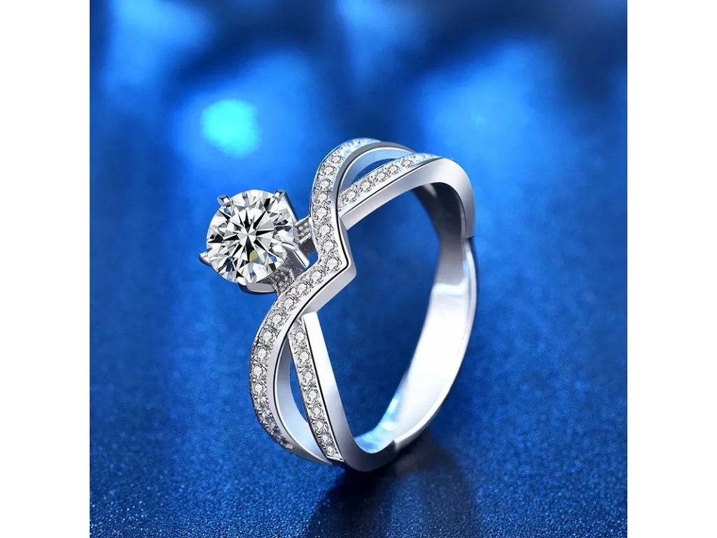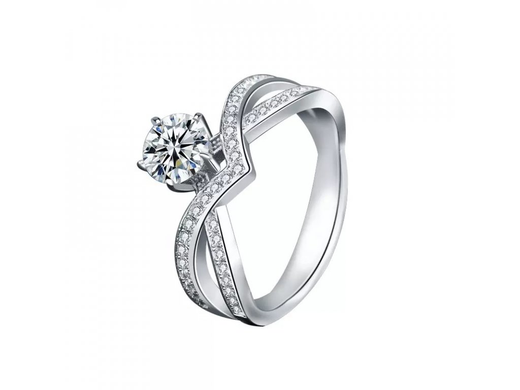 - Stříbrný rhodiovaný prsten zdobený zářivým drahokamem moissanitem a okolními třpytivými zirkony. Originální design prstenu, kvalitní zpracování a materiál, ručně dohotovené.