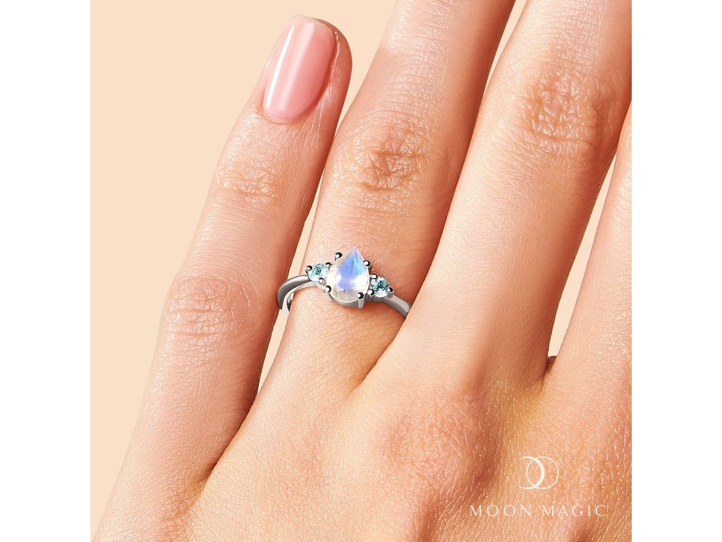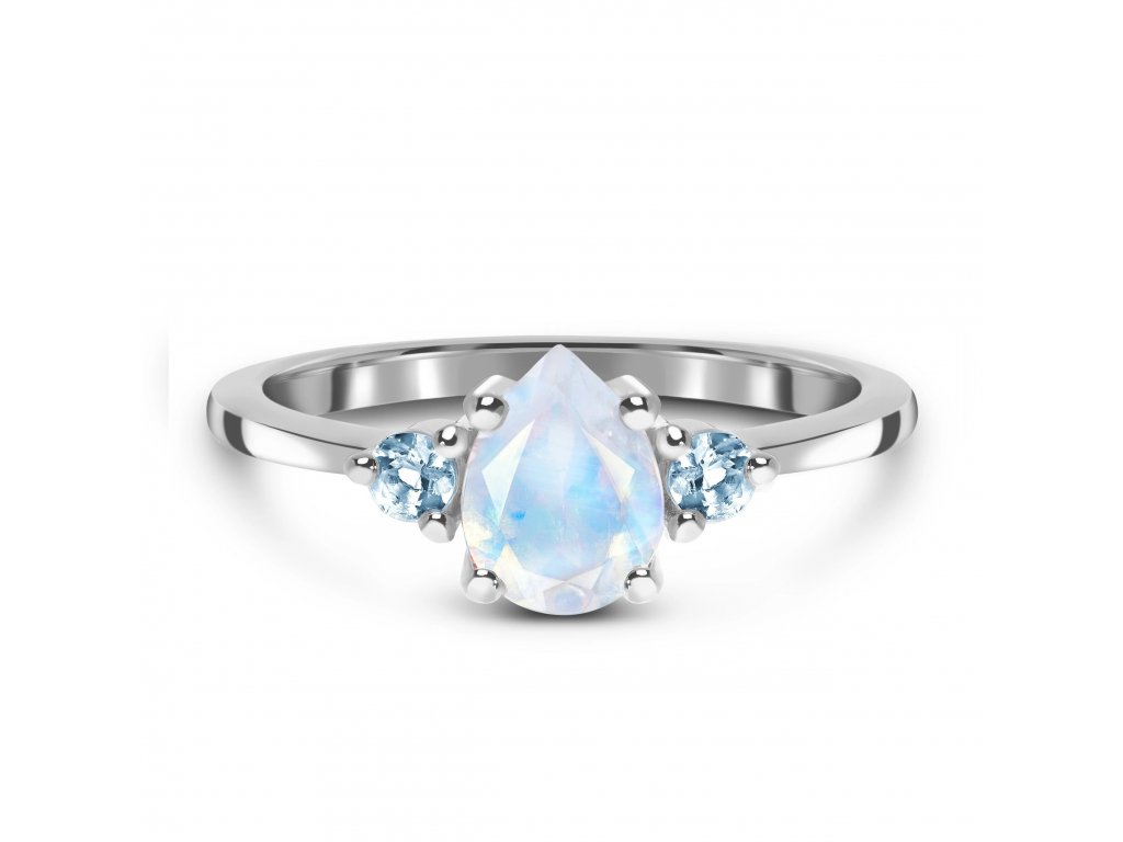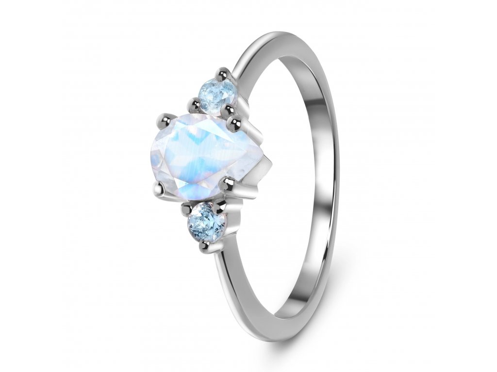 Luxusní romantický stříbrný prsten zdobený decentním měsíčním kamenem ve tvaru kapky a třpytivými drahokamy v podobě modrých topazů.