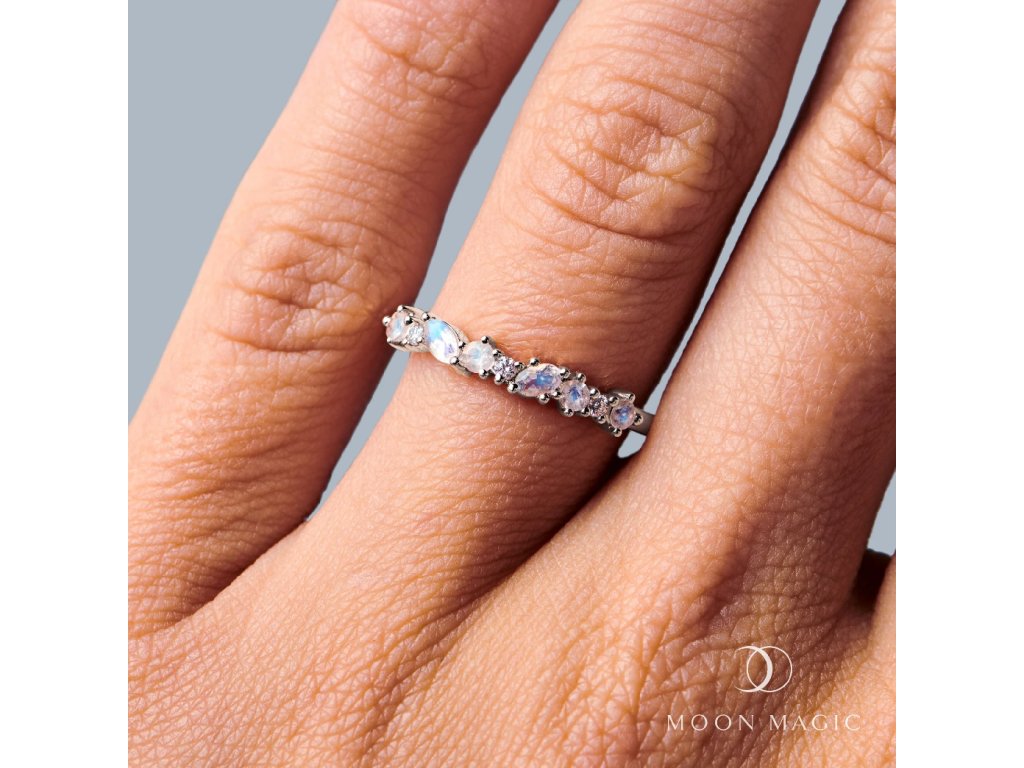 Jemný, ale půvabný prsten s řadou tvarů rozhodně není šperkařská klasika. Pomocí střídajících se třpytivých přírodních měsíčních kamenů a třpytivých skutečných drahokamů bílých topazů používá tento prsten hravé tvary k vytvoření prstenu se sofistikovaným kouzlem.