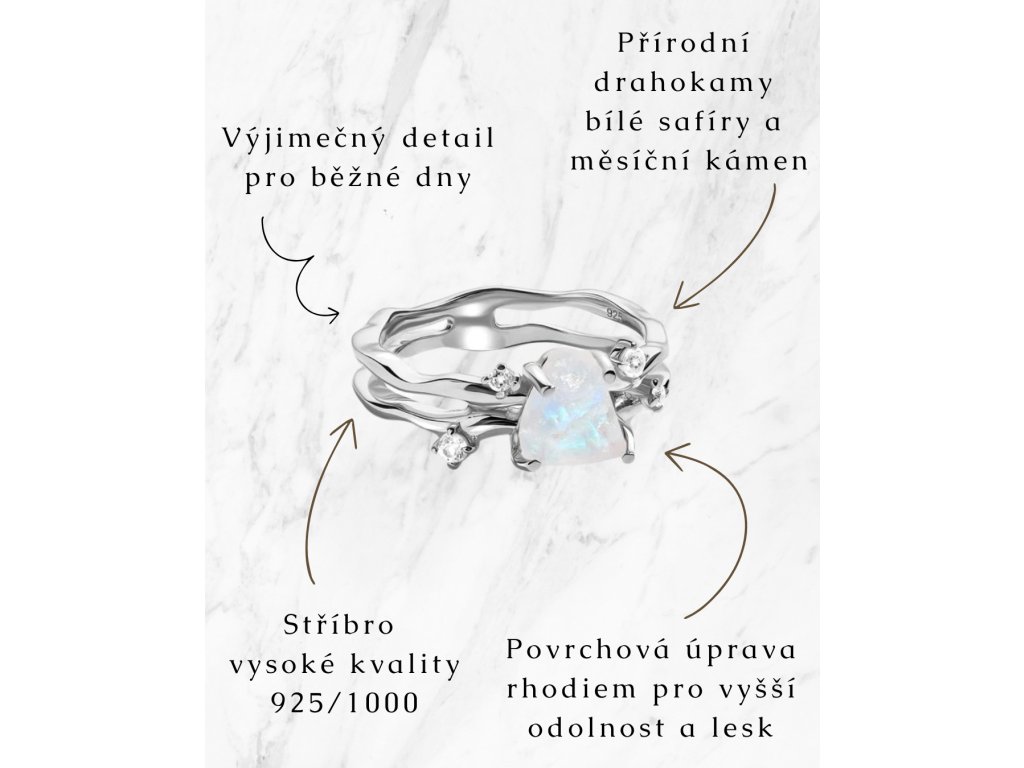 - Luxusní stříbrný rhodiovaný prsten Raw Krystal obohacený drahokamem moonstonem a drahokamy safíry. Originální design prstenu, kvalitní zpracování a materiál, ručně dohotovené.