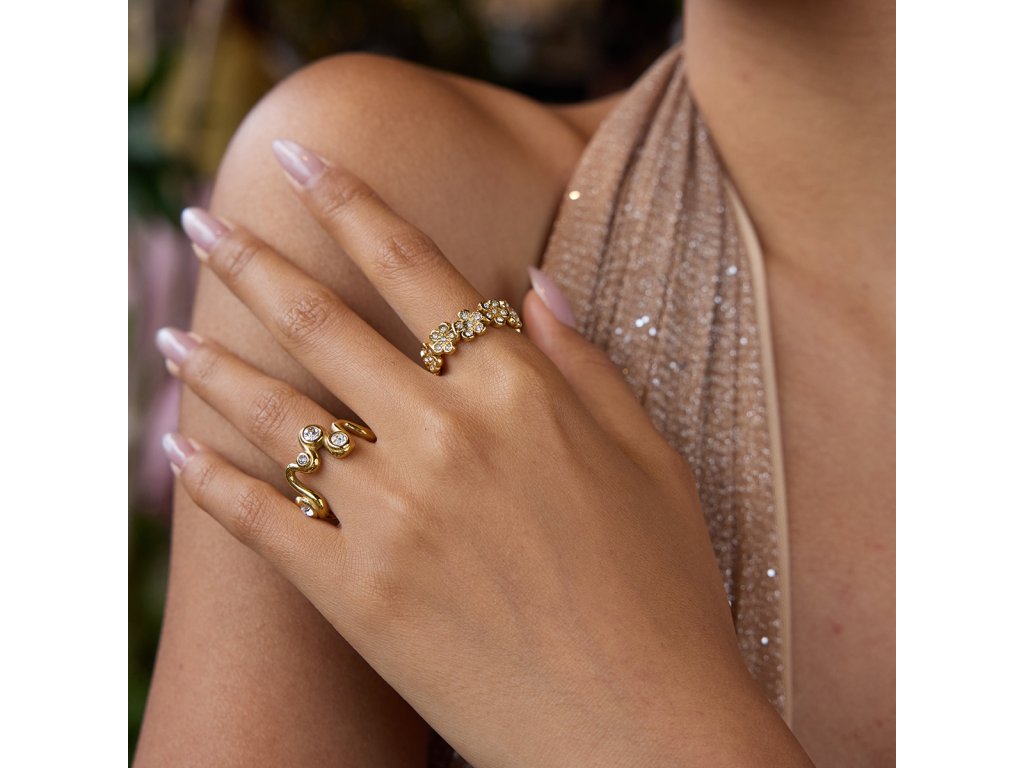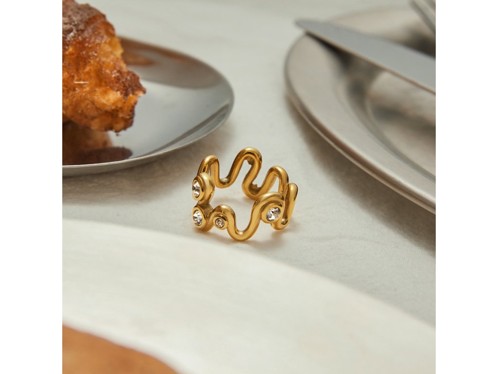ELENYS Wave vychází z organického pohybu vody: plynulé křivky se střídají s jemnými kamínky v hladkém osazení, díky čemuž prsten působí současně hravě i sofistikovaně. Lesk 18k žlutého zlata zvýrazňuje měkké objemy a dává tvaru hloubku.